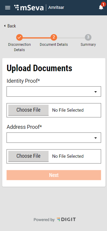 Clicking on Disconnect it navigates to the Water and Sewerage Disconnection Application Document required screen.