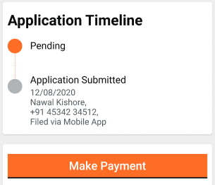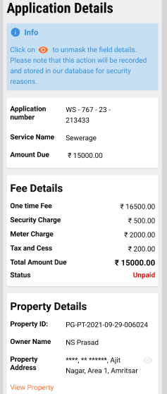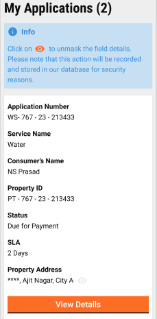 Users can review the list of applications and their status registered under their mobile numbers in the My Applications tab. Each application for the initial view displays Application No., Service Name, Consumer Name, Property Id, Status, SLA and Property Address with the View Details option, through which the user can look up more details about the application.