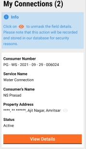 Users can review the list of connections and their status registered under their mobile number in the My Connections tab. Each connection in the initial view will display the Consumer No, Service Name, Consumer Name, status, and property Address with the View Details option, through which the User can look up more details about the connection.