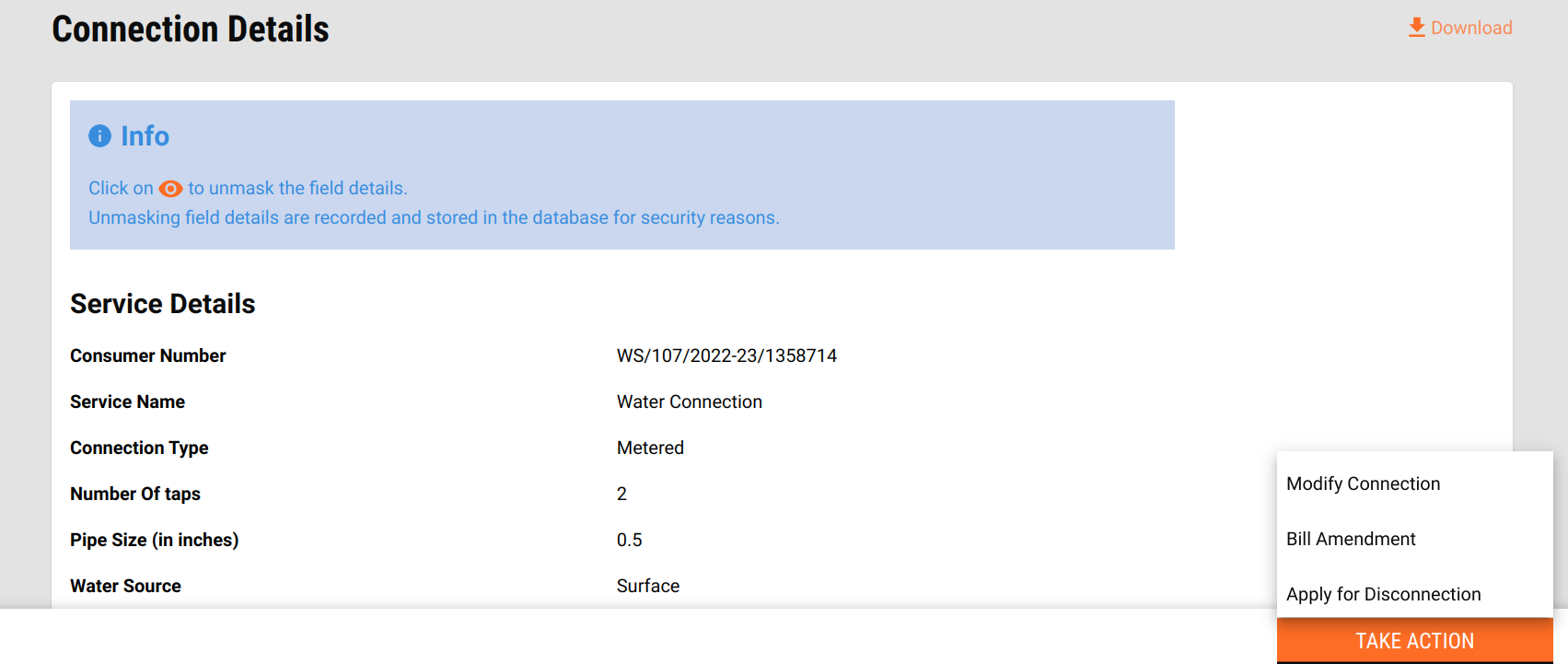Once a new application connection is activated, the system generates the consumer code. This code is used to route users to the connection details screen from the search/connection screen. Clicking on the Take Action button displays multiple options based on conditions. Clicking on the Modify Connection option routes users to the modify screen.