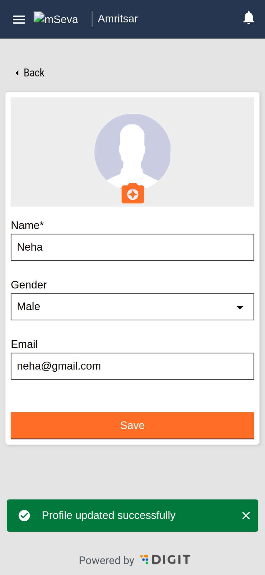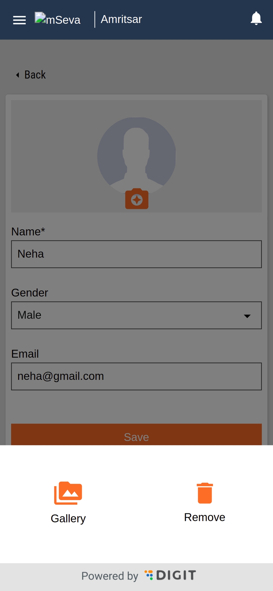 Clicking on the camera icon displays the bottom drawer. Select the upload photo from the gallery or remove the profile picture option as required.