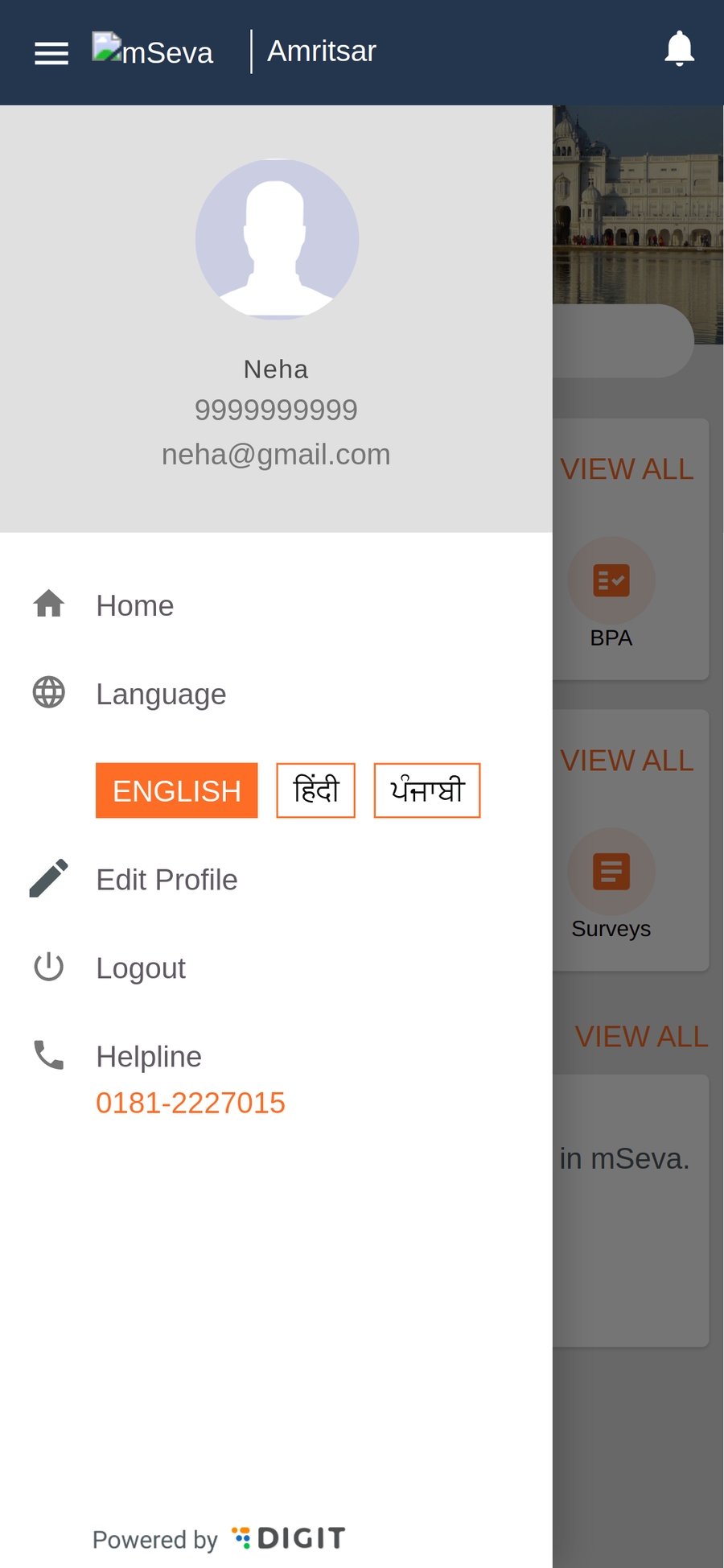 The User Profile page for citizens can be accessed by clicking on the Edit Profile icon in the app drawer. Click on the hamburger menu in the top bar on the app to open the app drawer.