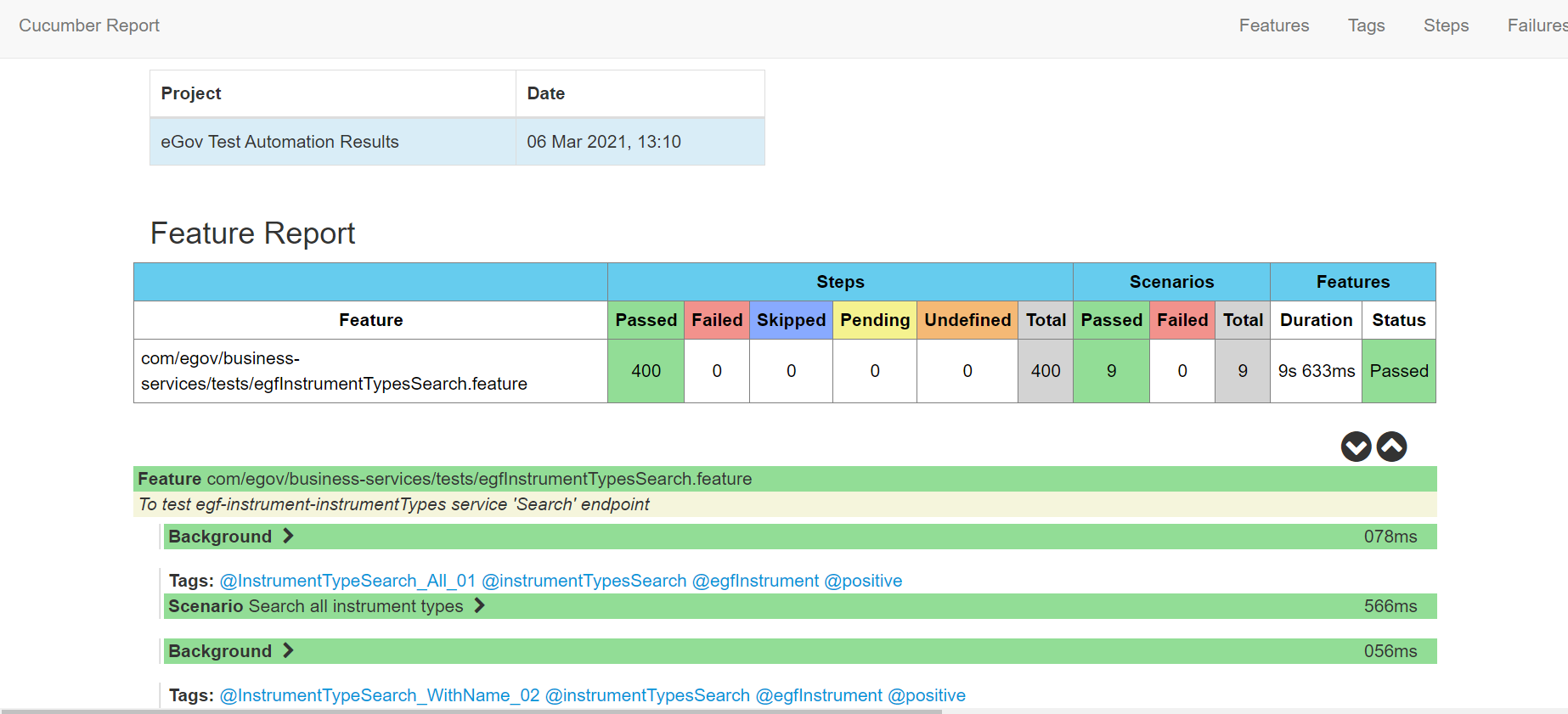 Test Results target folder: eGov Test Automation Results are composed at cucumber-html-reports with timestamp of test execution reports.