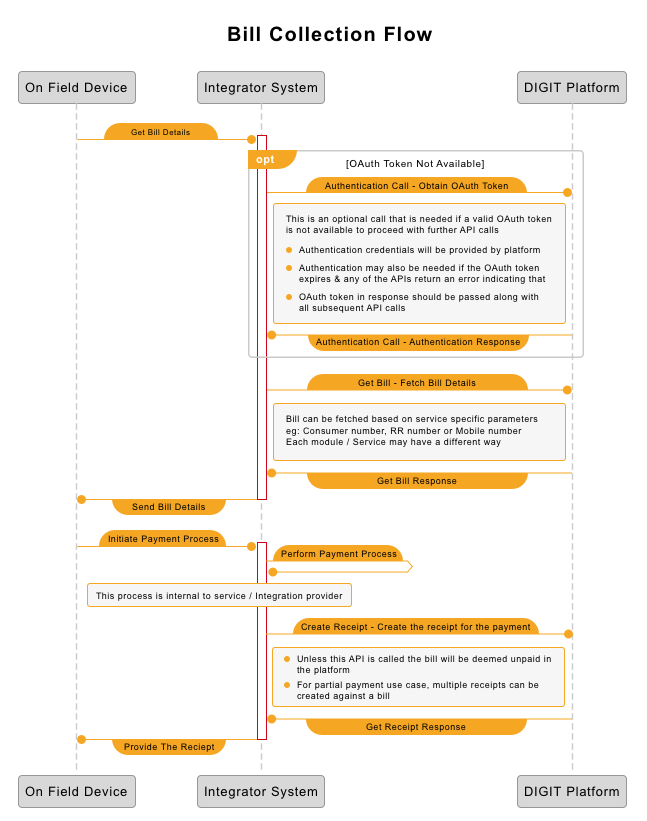 Once the bill is fetched from the DIGIT system, the system integrator is expected to relay it back to the Field Device. The integrator is expected to Initiate and collect the payment based on government preference indicated in the bill (can it be partially paid and if so the minimum amount etc.) and citizen's preference of payment instrument etc.