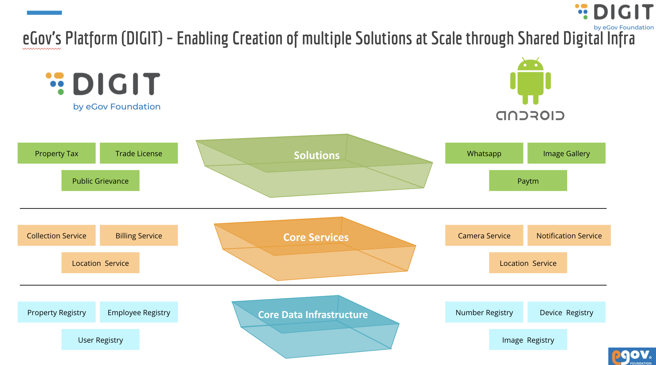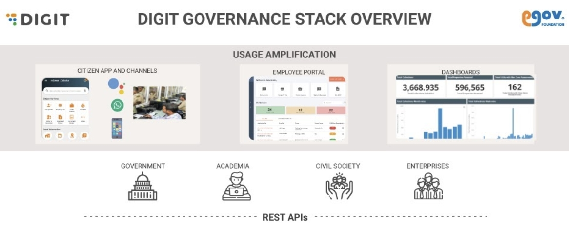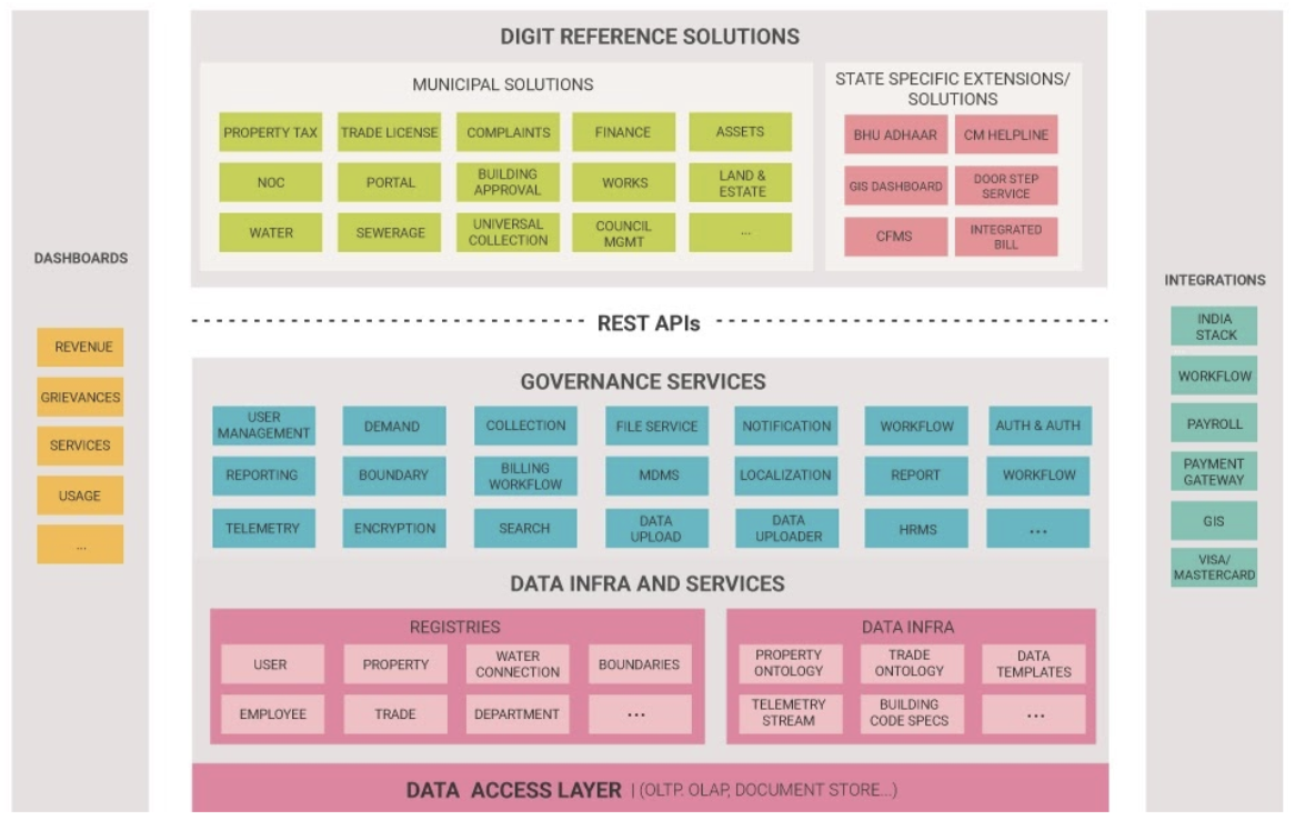 The Urban governance stack is built on DIGIT - an open-source platform for digital governance. It is built on OpenAPI (OAS 2.0) and provides API-based access to a variety of urban/municipal services enabling state governments and city administrators to provide citizen services with relevant new services and also integrate the existing system into the platform and run seamlessly on any commercial/on-prem cloud infrastructure with scale and speed.
