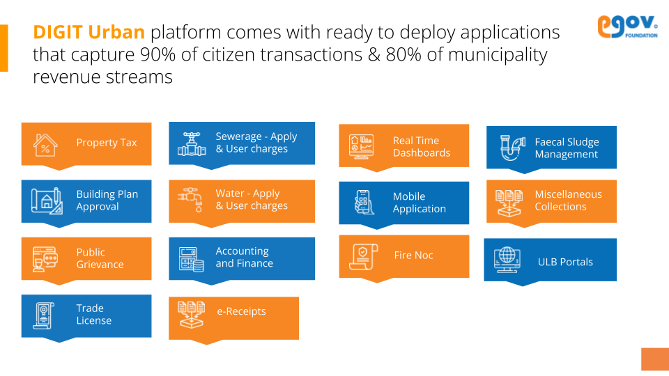 The DIGIT Urban governance stack comes with ready to deploy applications that capture 90% of citizen transactions & 80% of municipality revenue streams.