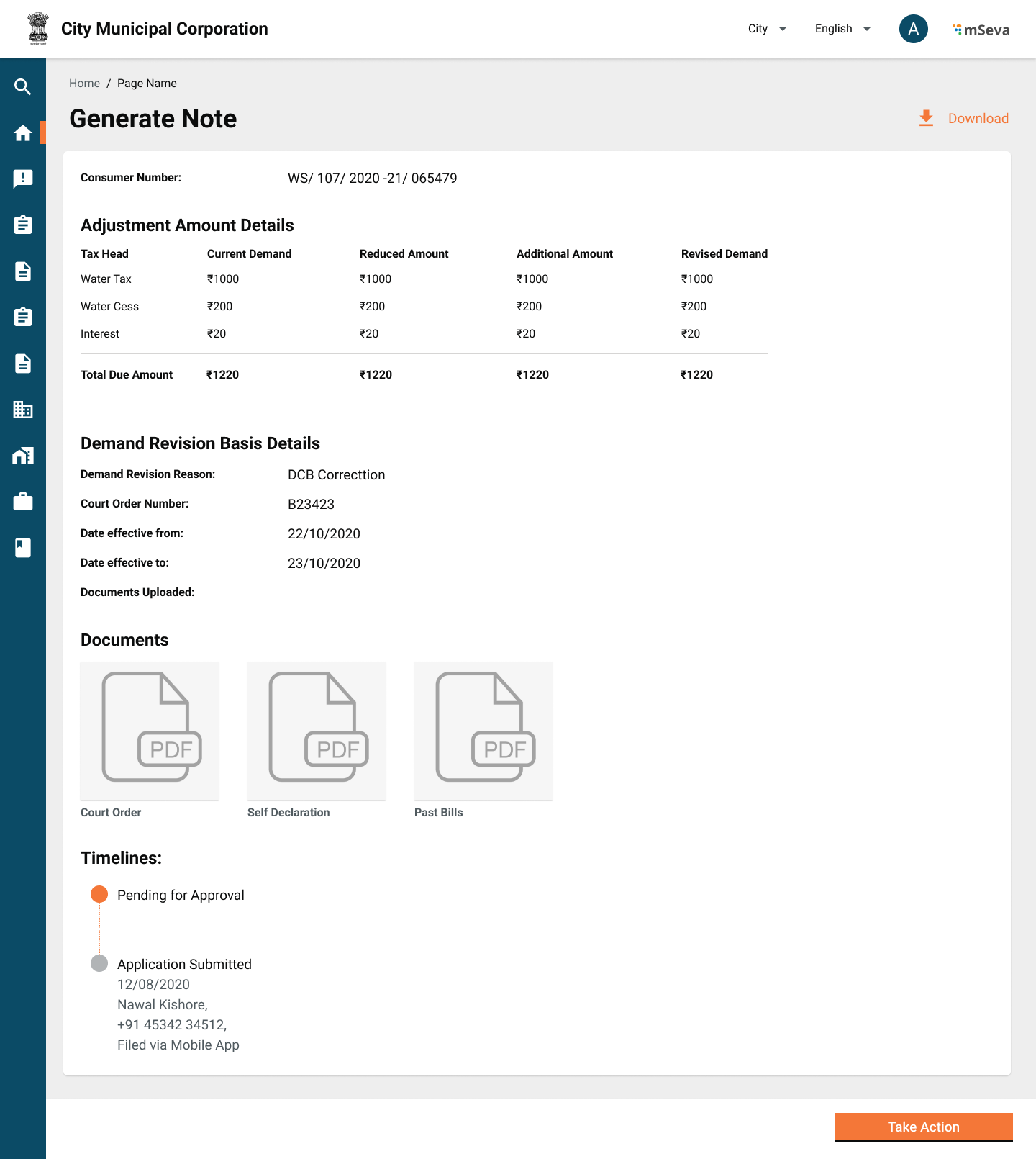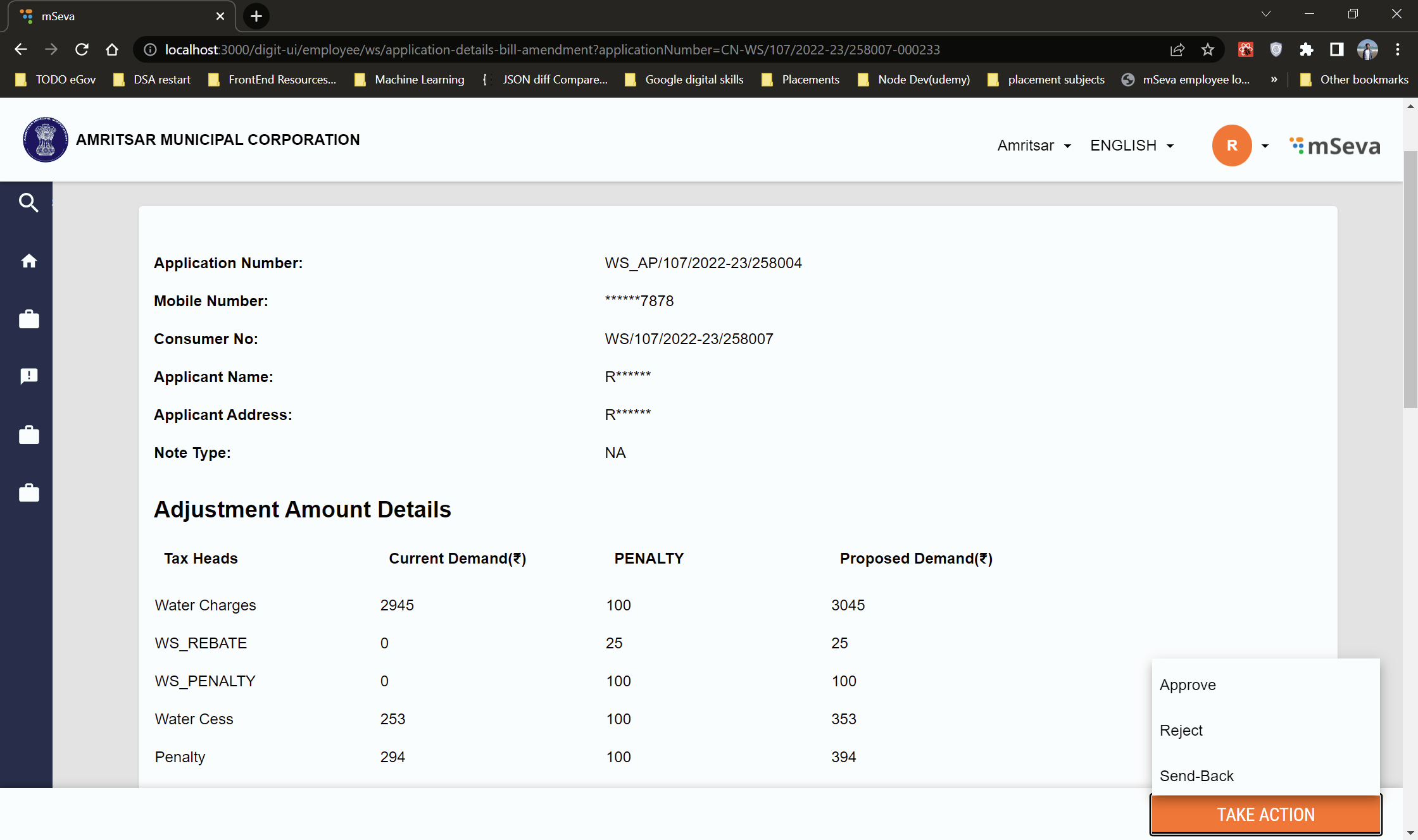The Application Details page of the bill amendment contains the Take Action button on the action bar at the bottom of the screen. The Take Action button opens a dropdown that contains some options described below. After clicking any of the given options an Action modal window is rendered.
