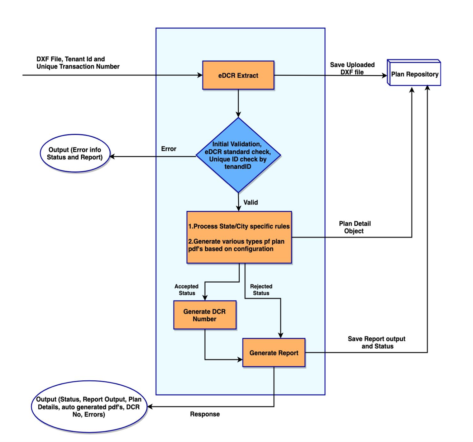 eDCR system will provide REST APIs to push drawing files (DXF format) along with a unique ID. The Integrating system will provide a unique Transaction Number. The same will be used by both systems to track applications.