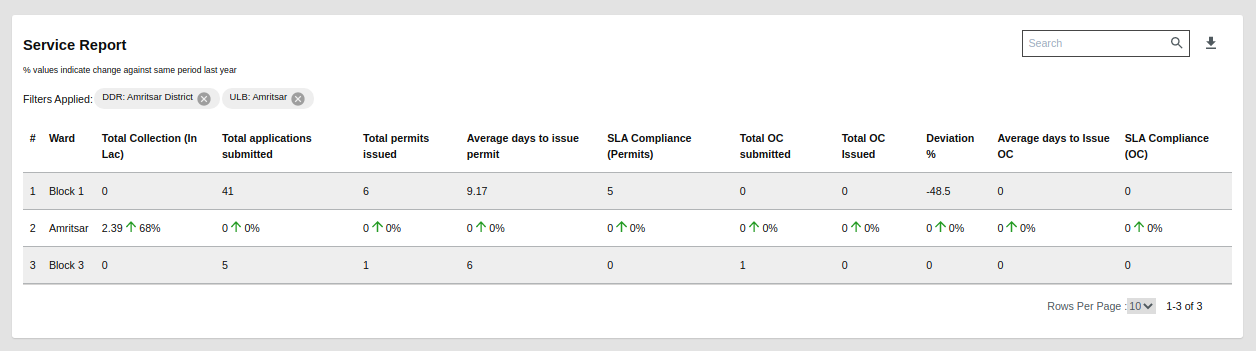 **Service Report:** This tabular chart representation graph shows information about multiple OBPS-related categories like Total Collection or Total Cumulative Collection, Total Plans Scrutinized, Total applications submitted, Total permits issued, Avg. days to issue a permit, SLA Compliance (Permits), Total OC Plans scrutinized, Total OC submitted, Total OC issued, Deviation Percentage, Avg. days to issue OC, SLA Compliance (OC), Total OCs with deviation. This table also shows the data at the state level and also has the drill-down chart for each state to ULB and from ULB to ward level data for the same.