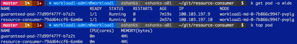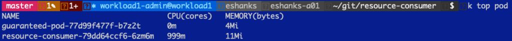 And if we look at the container's resources you can see that even though the container wants to use a 2000m CPU, it is actually using a 1000m CPU only. The reason for this is that the guaranteed pod is guaranteed a 1000m CPU, whether it is actively using that CPU or not.