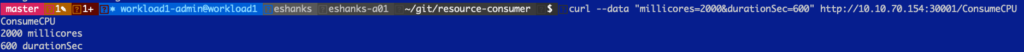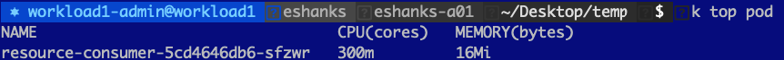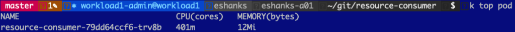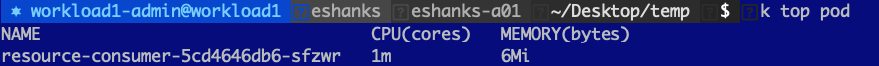 Let us try out using a CPU limit on a pod and see what happens when we try to request more CPU than we’re allowed to have. Before we set the limit though, let us look at a pod with a single container under normal conditions. I’ve deployed a resource consumer container in my cluster and by default, you can see that I am using 1m CPU(cores) and 6 Mi(bytes) of memory.