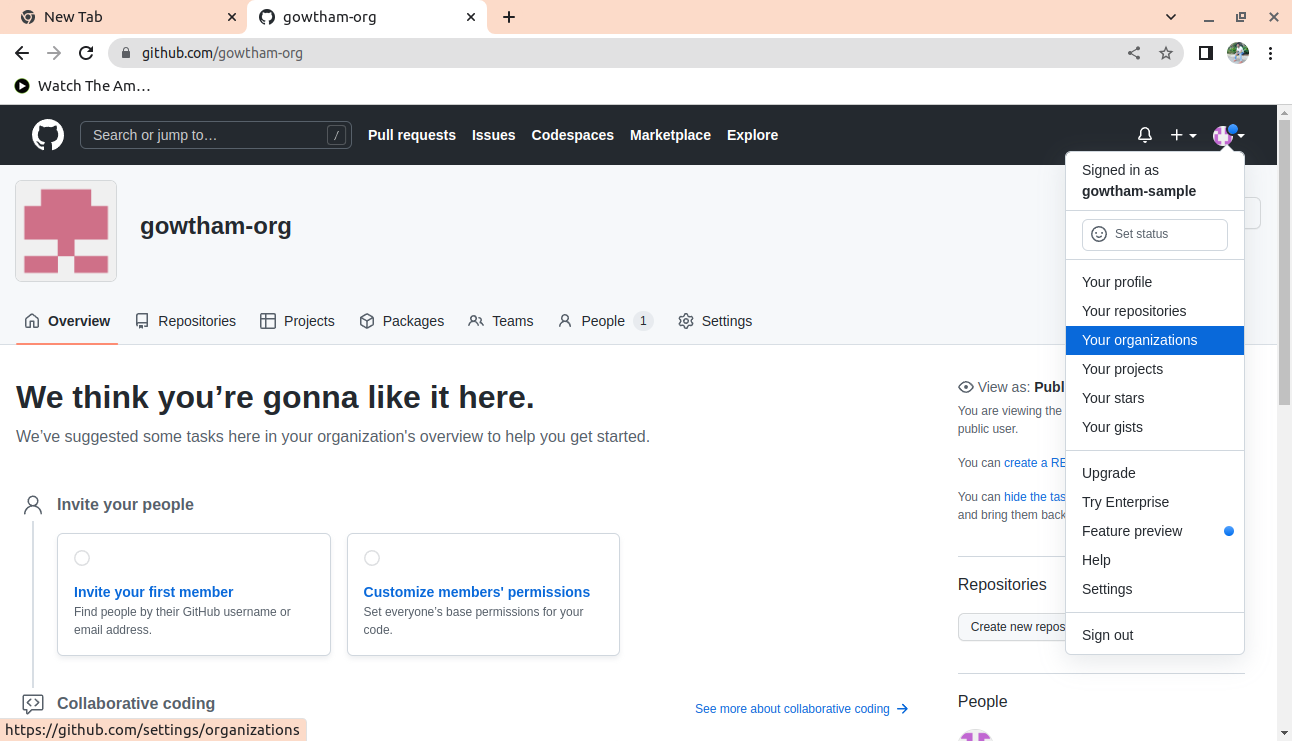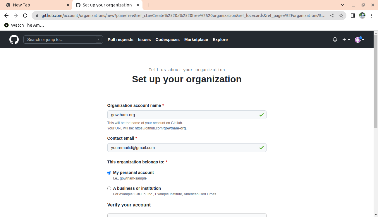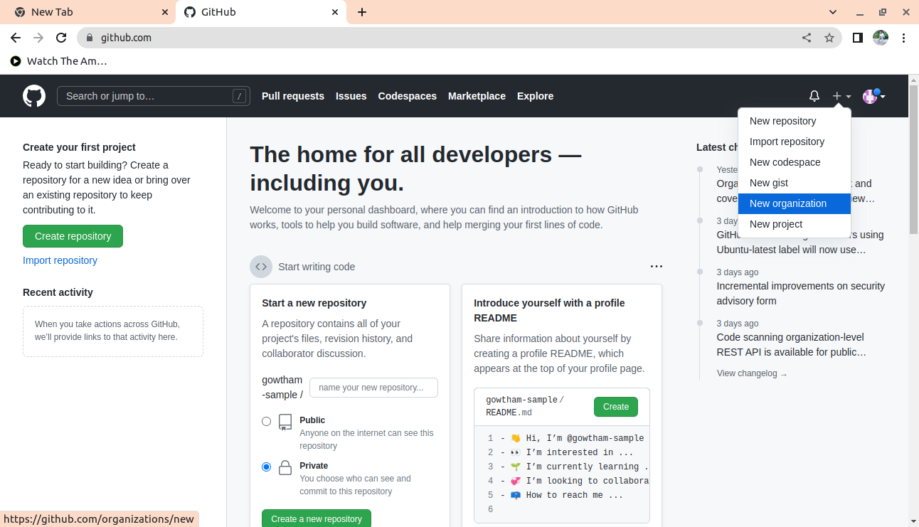 * Open Github and click on the "**+**" icon add top tight corner. You will see the option"**new organization**". click it.