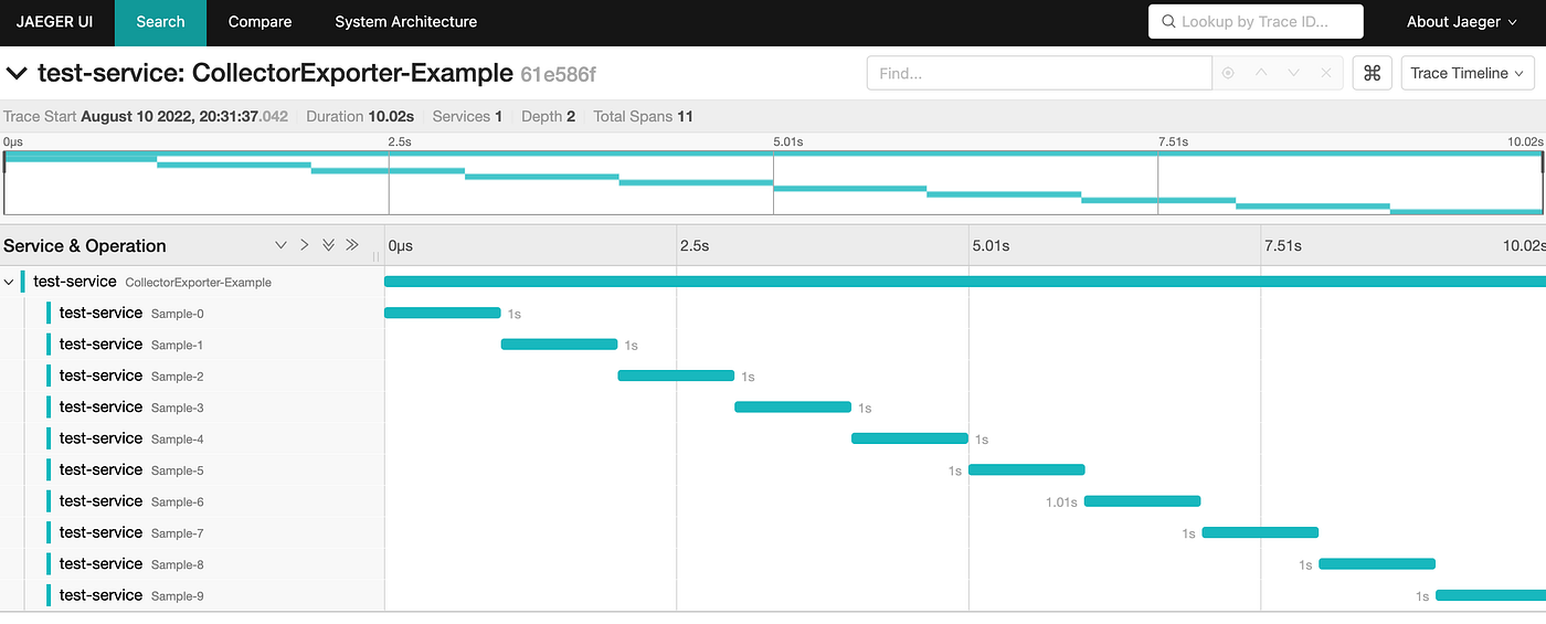 Make sure to change the name of the jaeger collector (exporter) to match the one we deployed above. In our case, that would be: