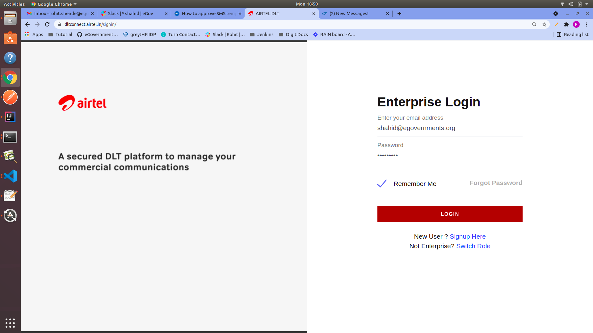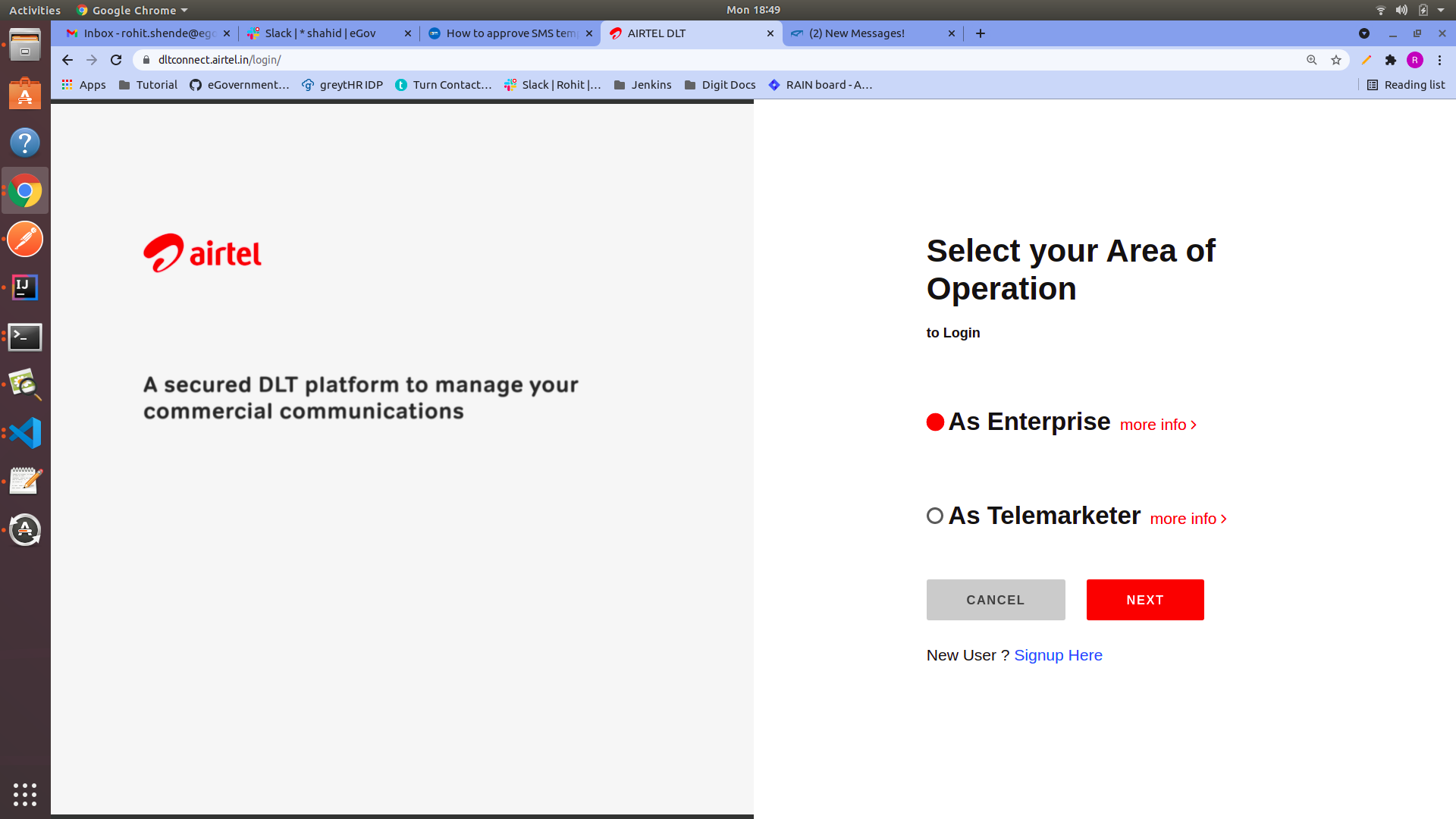 **Step 1:** Visit the **Airtel DLT portal** ([<img src="https://dltconnect.airtel.in/static/img/fav.png" alt="" data-size="line">AIRTEL DLT](https://dltconnect.airtel.in/login/) ) and select your area of operation as **Enterprise** then click on next.