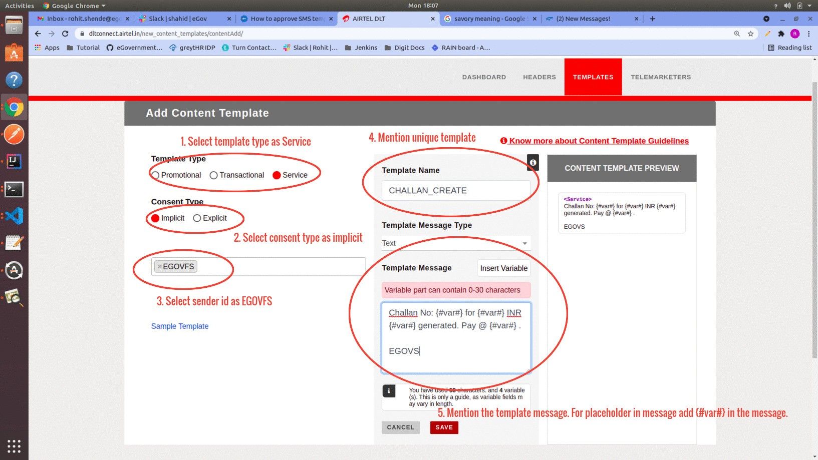 **Step 8:** Mention the template ID and message of the approved template which we saved earlier in step 4. Select the Sender ID as **EGOVFS.**
