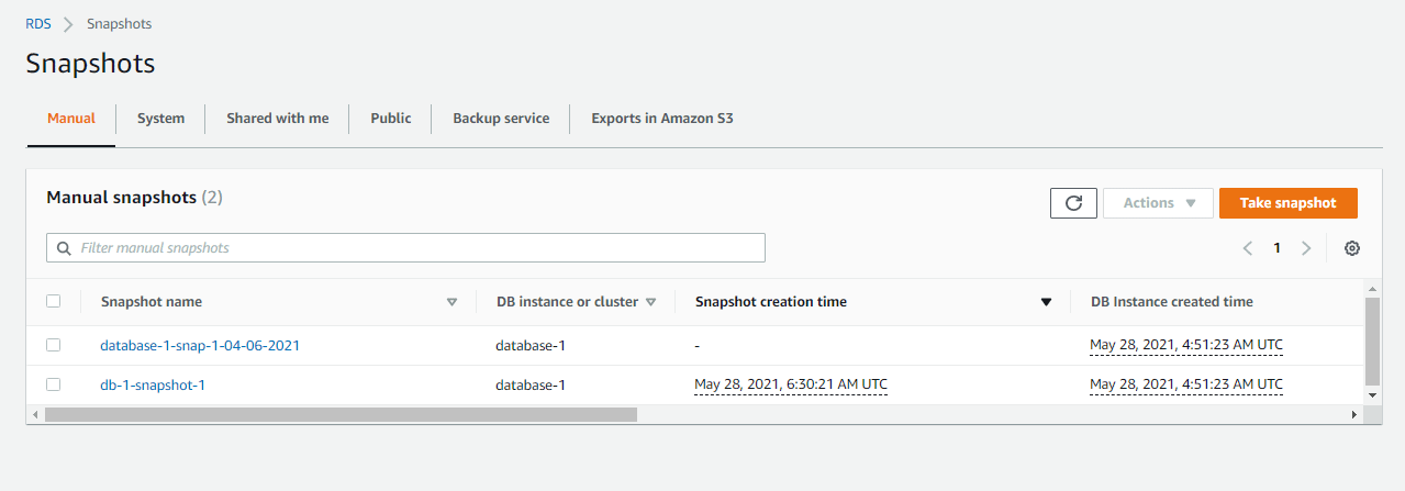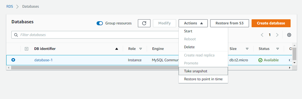 To create a manual snapshot, select the RDS instance you want to back up. Click on the Actions button in the right upper corner and select Take a snapshot.