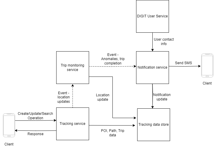 Tracking service should be generic enough to handle any kind of citizen services that involve movement of assets or service delivery by an operator on move. Type of service being rendered decides the monitoring rules (alerts, notifications) that are applied to the trip.