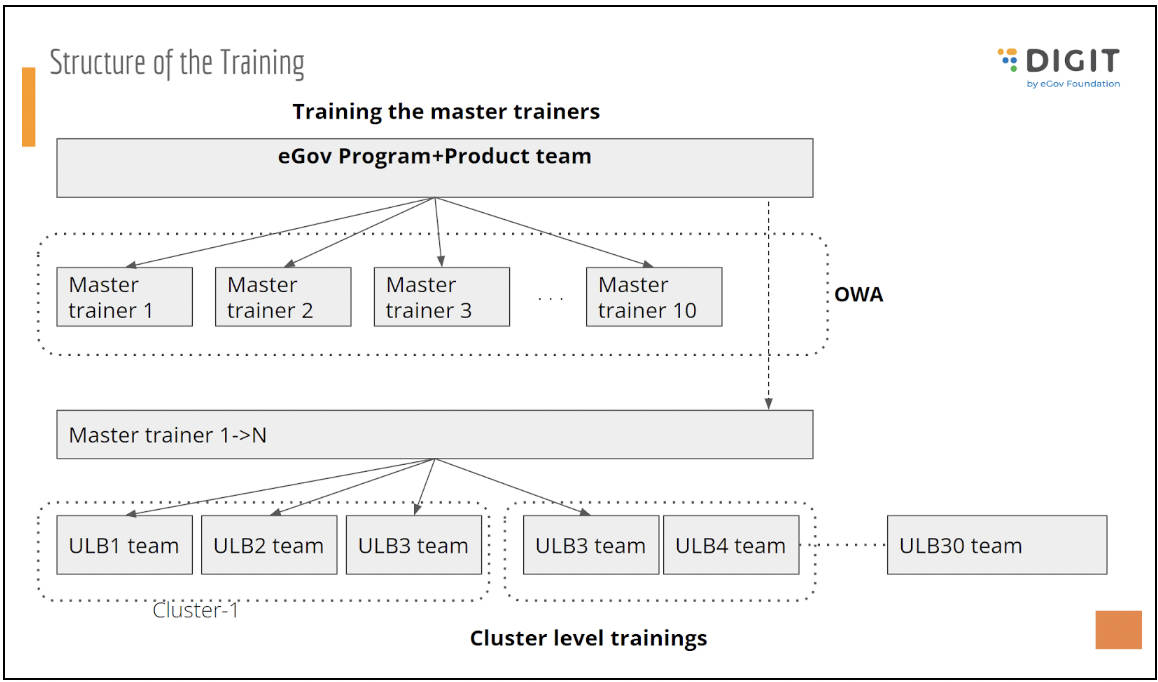 It is proposed that the complete training plan and the creation of the training assets will be owned by eGov Foundation, while the master trainers for training the ULB FSSM executives and TRPs will be provided by OWA from its pool of resources with the support of eGov Foundation. These master trainers will be trained by eGov Foundation, and they will further disseminate the knowhow to ULBs, first at a central location, and then physically by visiting each of the ULBs within a cluster for refresher sessions.