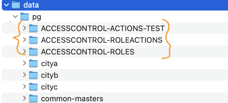 In the above image, "pg" is the state level tenant. The three folders highlighted in orange contain the masters for actions, roleactions and roles respectively.&#x20;
