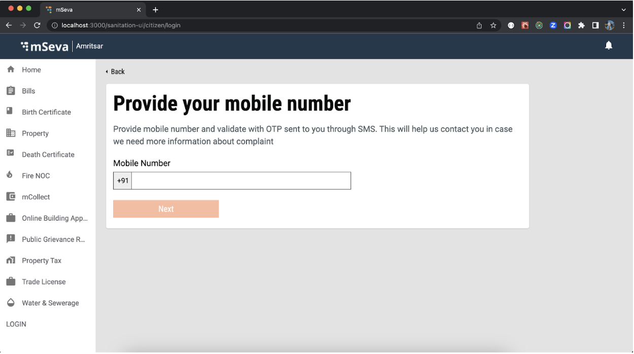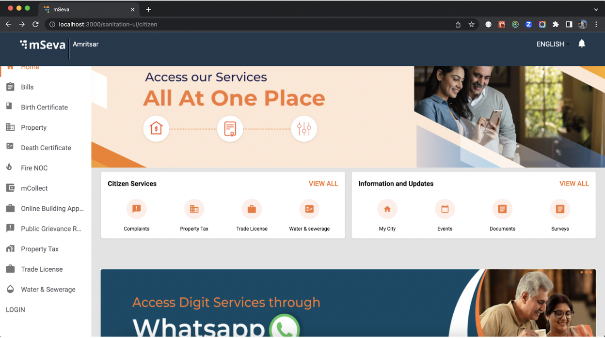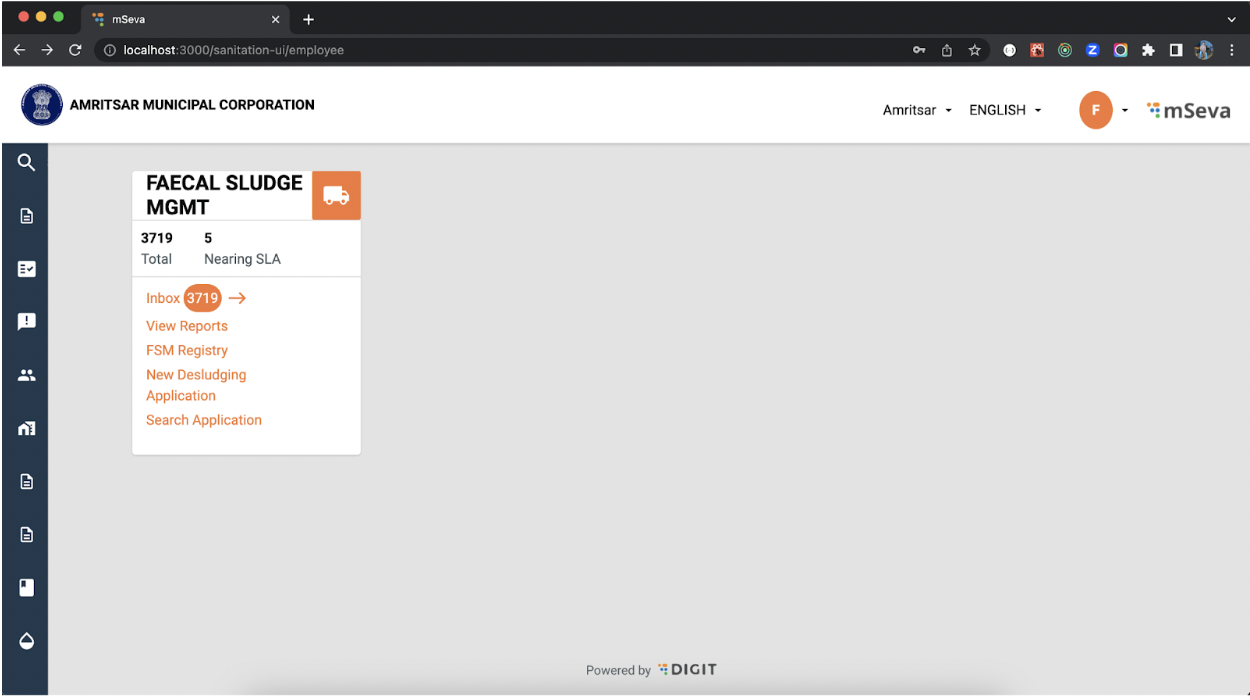 On the homepage, users can see the cards for FSM. These cards need to be added. Go through the link to create an employee card. Homepage Citizen: After the login is successful for citizens, users are redirected to the citizen homepage.