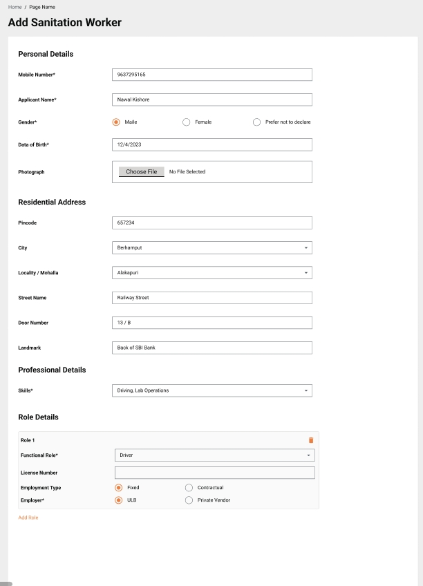 Admins can fill the "Add Sanitation Worker" form to create sanitation workers in the system.