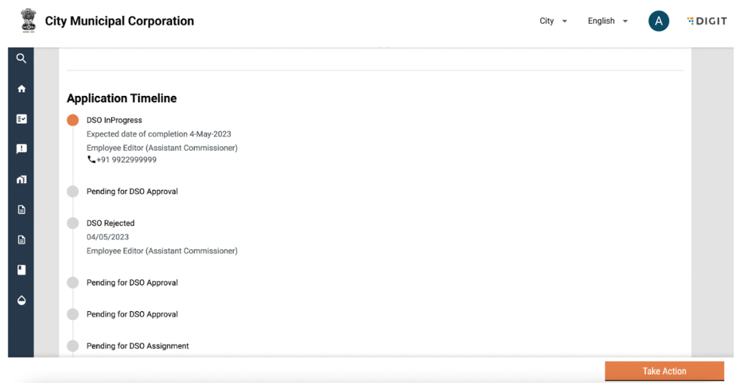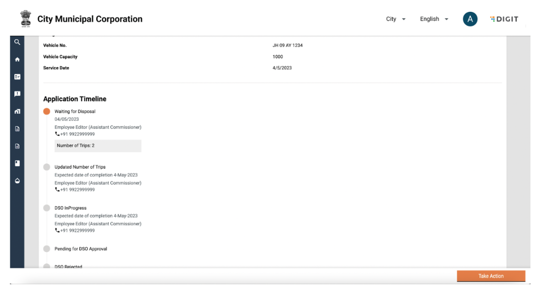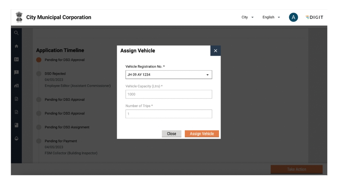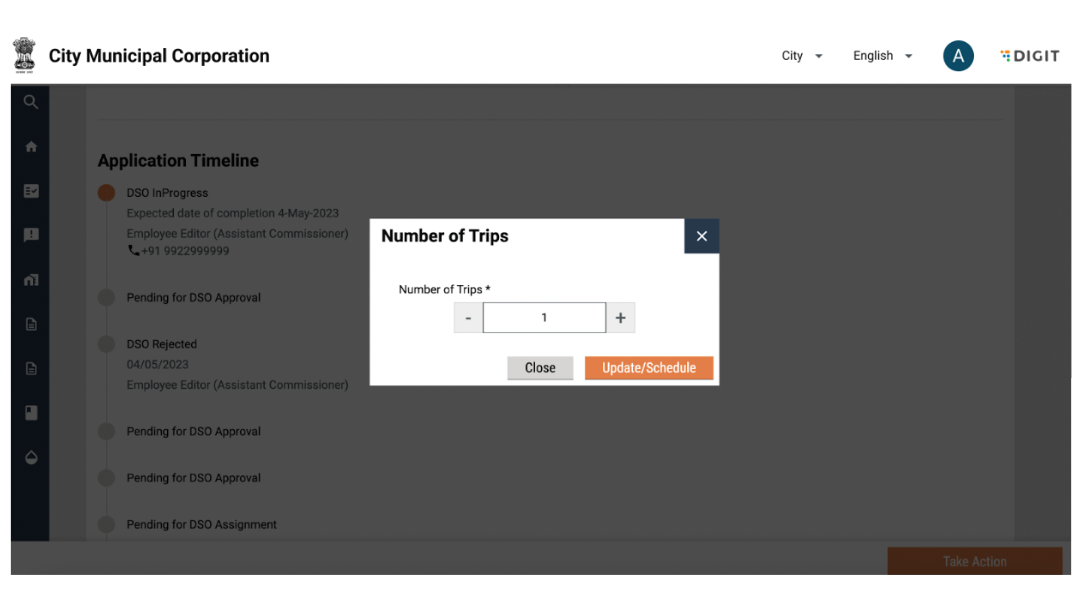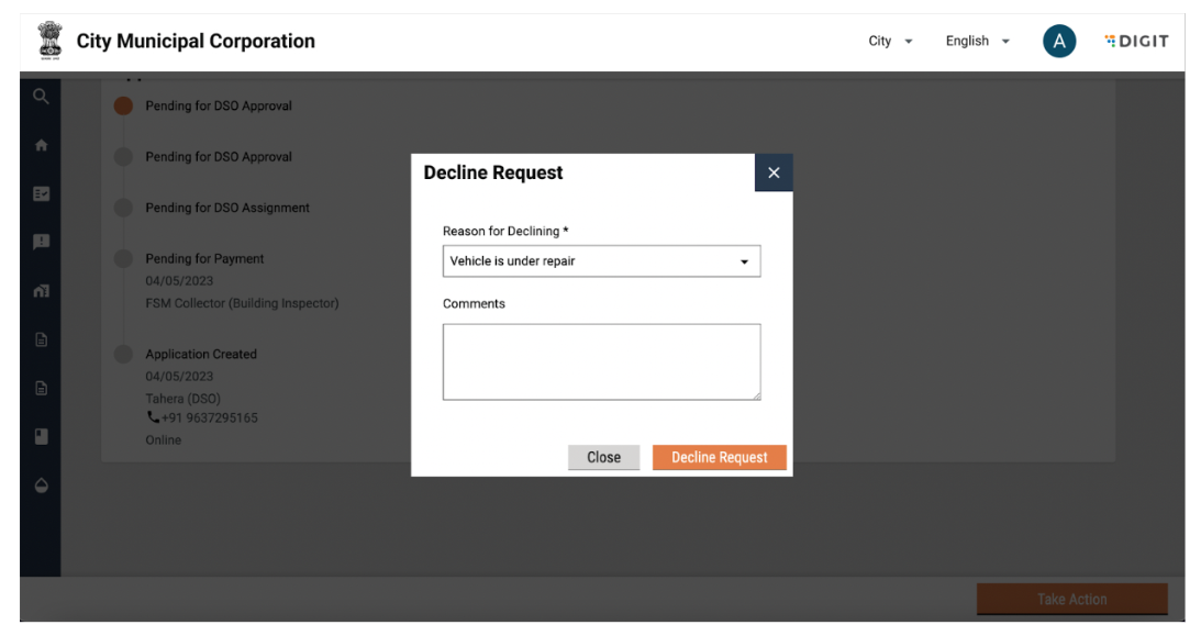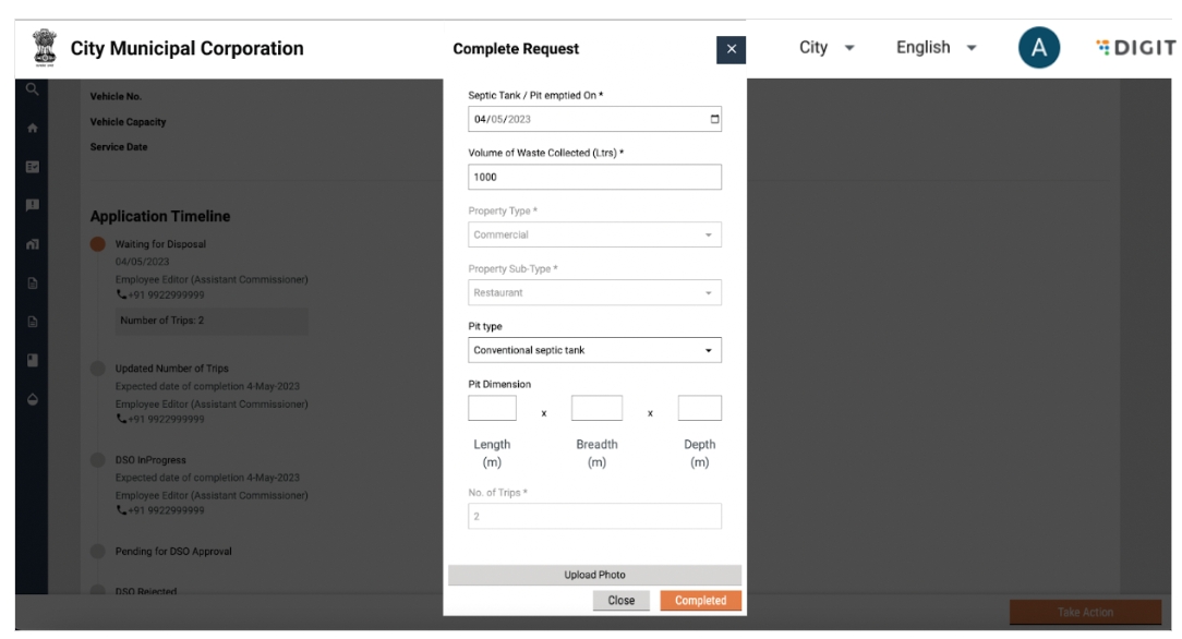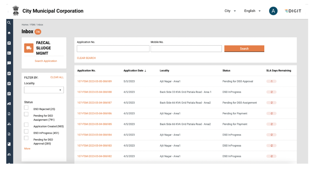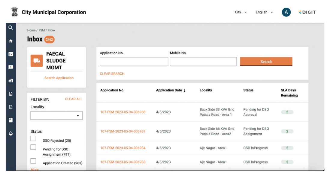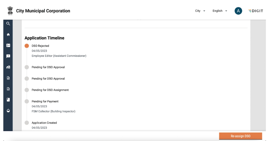 The Desludging Operators or DSOs are responsible for initiating and completing action on citizen requests for desludging services. The requests are routed to the respective DSOs by the urban local body (ULB) officials. The DSOs update the application status once the services are delivered and the payments are collected.