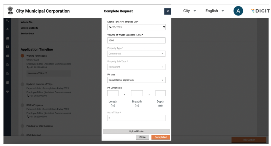 Once the service request has been completed and all pending payments have been collected, the same has to be confirmed in the system. This can be done by selecting the “Complete Request” button in the “Take Action” button. On clicking on Complete Request, the following pop up is displayed: