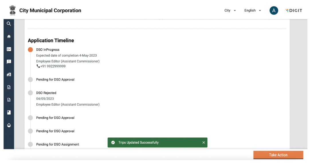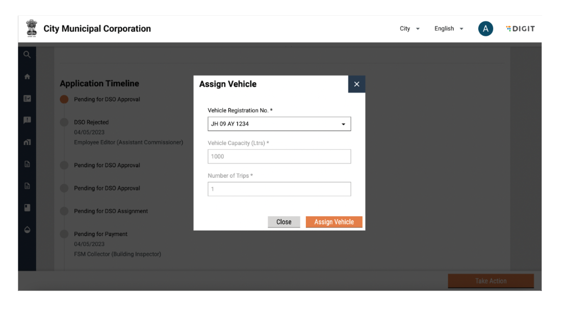 A snack bar will confirm assignment of vehicle and the application timeline will be updated to DSO in Progress.