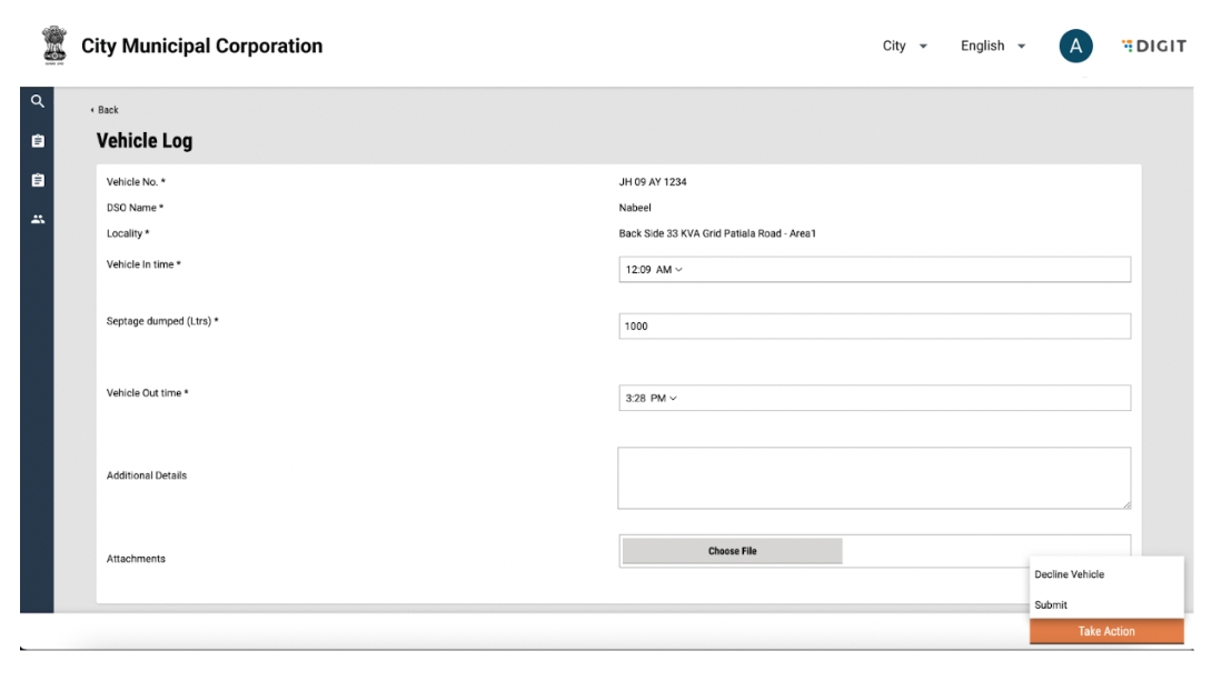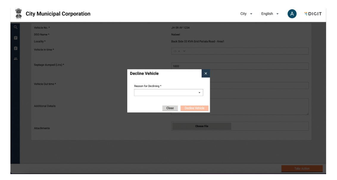 There are multiple reasons why a vehicle may be declined at the treatment plant, such as due to the quality of waste or if the plant is under maintenance. In such cases, the treatment plant operator may decline the incoming vehicle. This can be done from the application details page where the “Take Action” button has the option for Decline. On clicking on this, the following pop-up will appear.