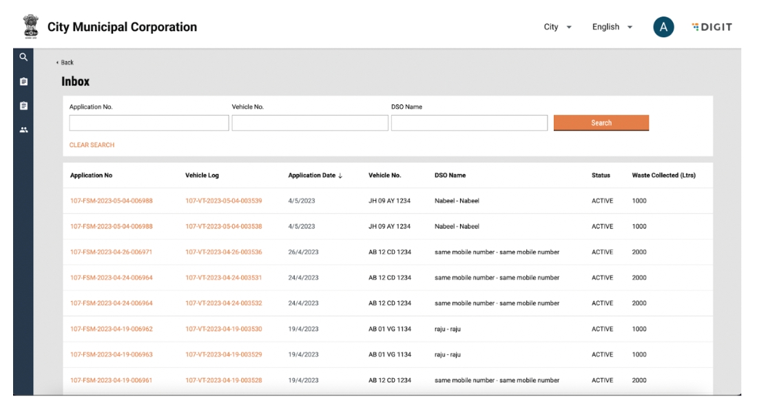 To view incoming vehicles for disposal against applications, the user can navigate to the inbox. The inbox displays a list of trips along with the vehicle number that is pending to be disposed off at a specific plant.