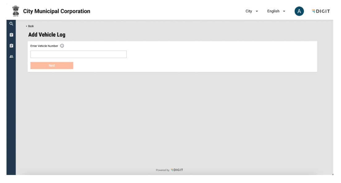 Once vehicle number is entered, the ‘Next’ button will be highlighted and the user will be redirected to the Vehicle Log screen.
