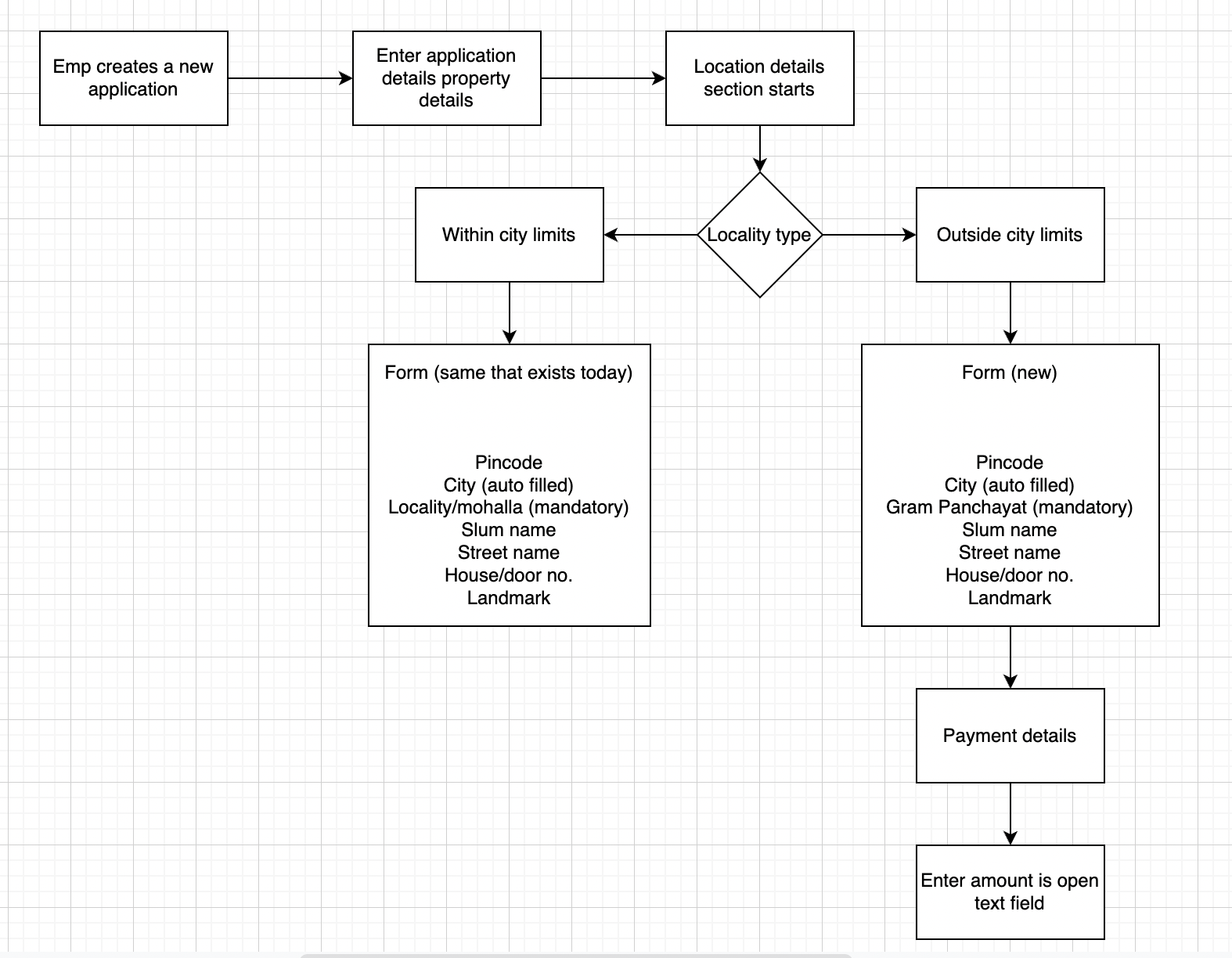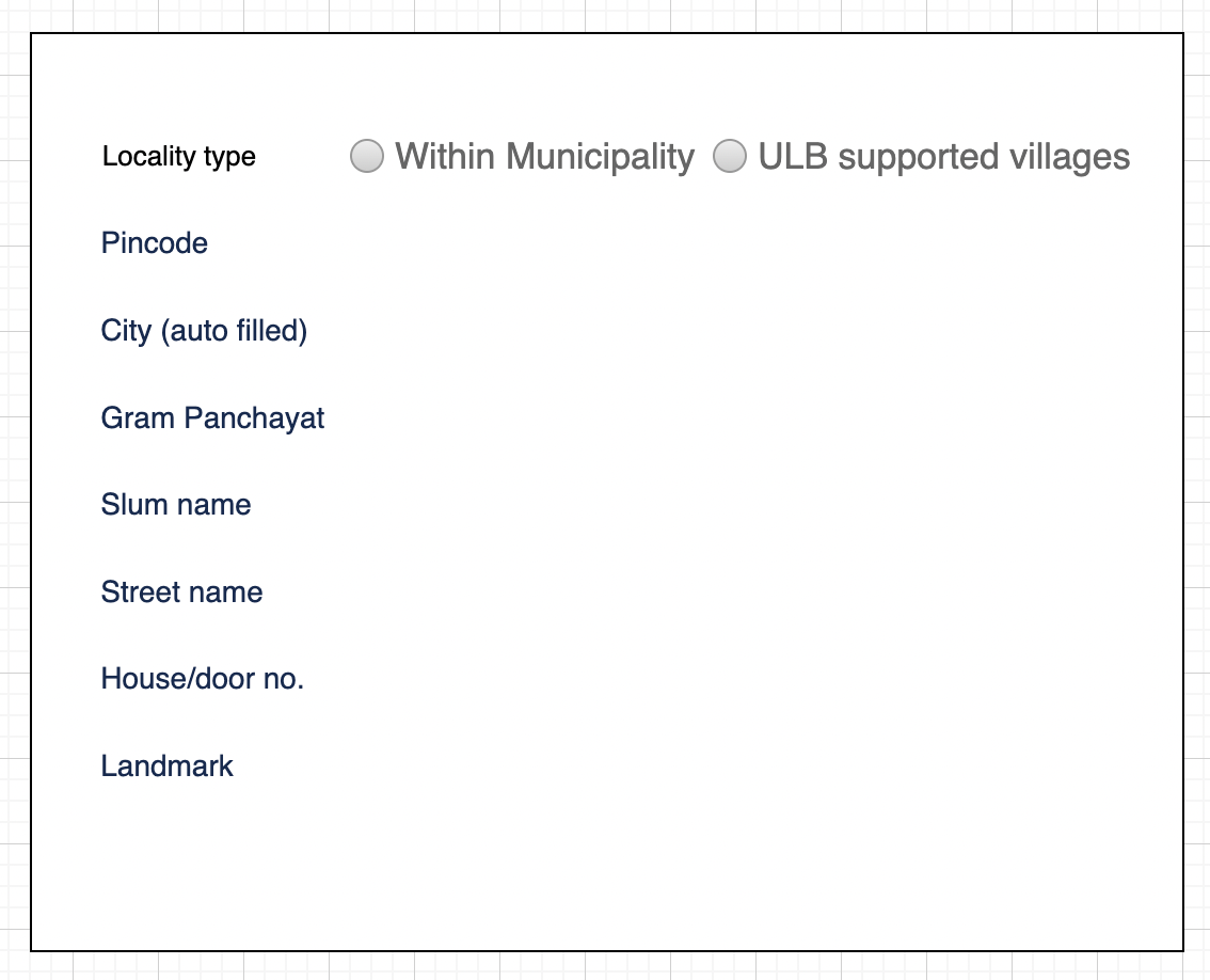By default, the 'Urban' option will be pre-selected in the radio button in the above wireframe and the drop-down will have the locality/mohalla master data. If an employee selects “ULB supported village”, then the locality/mohalla drop-down will be replaced by GPs and village drop-down data on the fly.