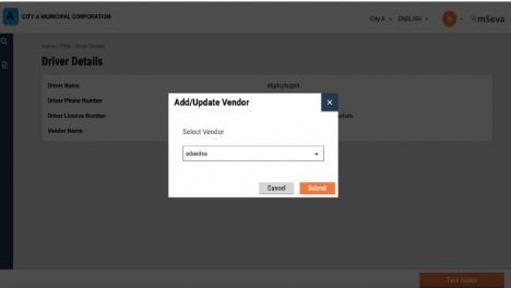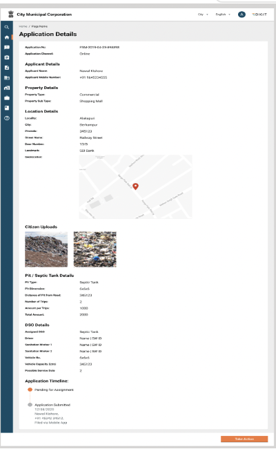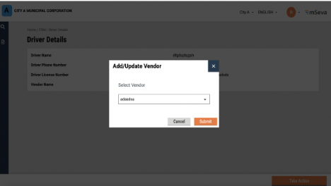 The DSO assigns a sanitation worker by clicking on the “Take Action” button and clicking an option of adding a vehicle and sanitation workers.