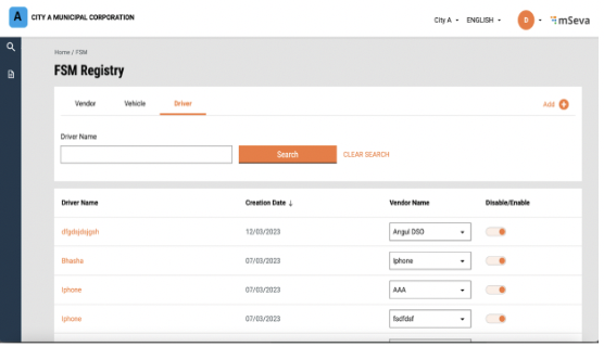 Sanitation workers can be managed via the FSM Registry implemented as part of V1.3. The FSM Registry allows for ULB admins to manage the list of vendors, vehicles and drivers.
