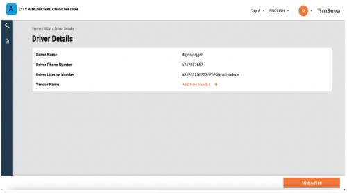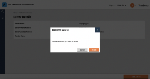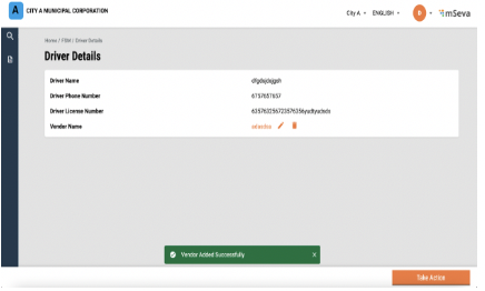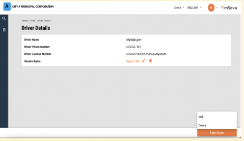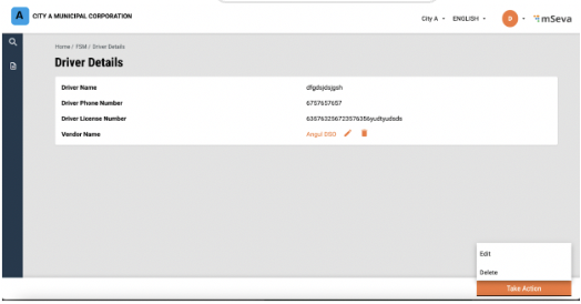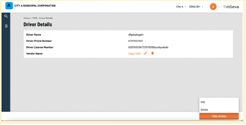 The user will be redirected to the sanitation worker details page and the edits will be reflected. can be deleted by clicking on the “Take Action” button. The user will be redirected to the sanitation worker details page, and the edits will be reflected in the details page and selecting delete.