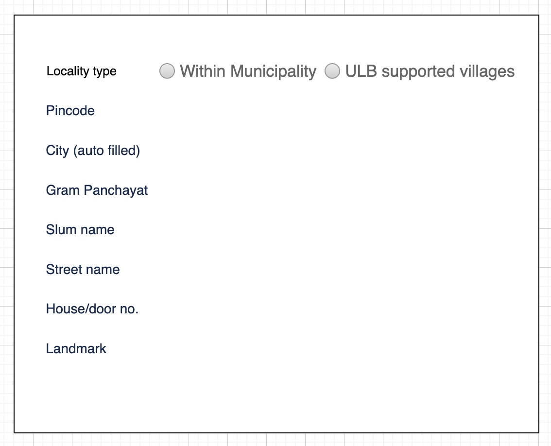 By Default “Urban” option will be pre-selected in the radio button in the above wireframe and the drop-down will have the locality/mohalla master data. In case if employee selects “ULB supported village” then the locality/mohalla dropdown will be replaced by GPs and Village drop-down data on the fly.