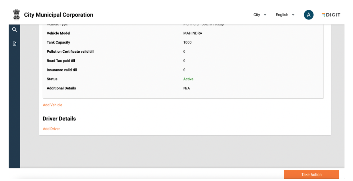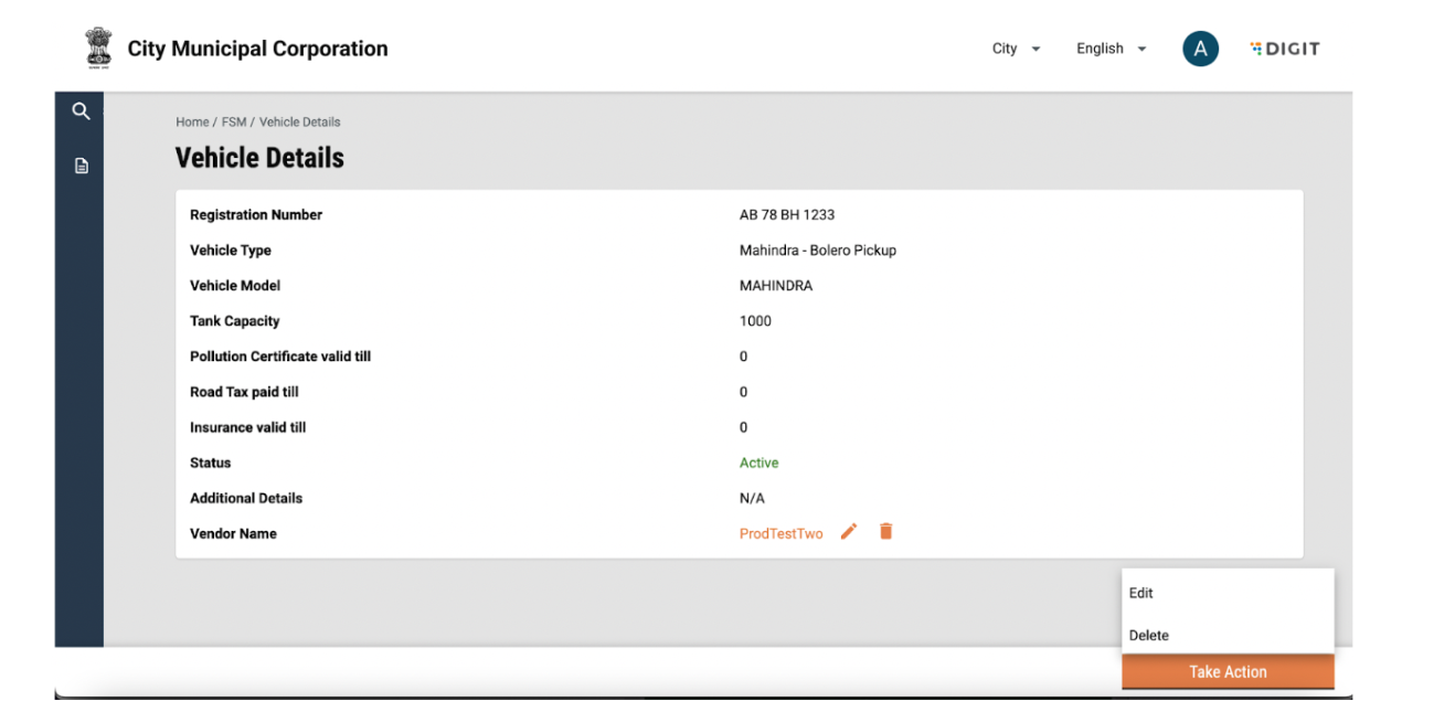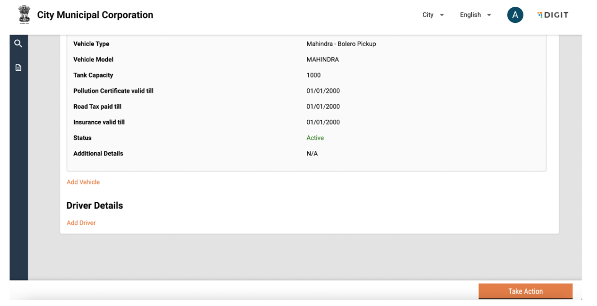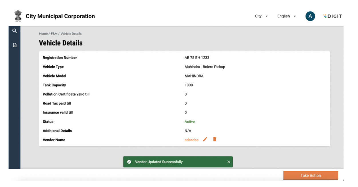 Vehicle details can be edited by clicking on the “Take Action” button and selecting edit. Add or edit information and click on submit application. The changes will reflect in the vehicle details page.