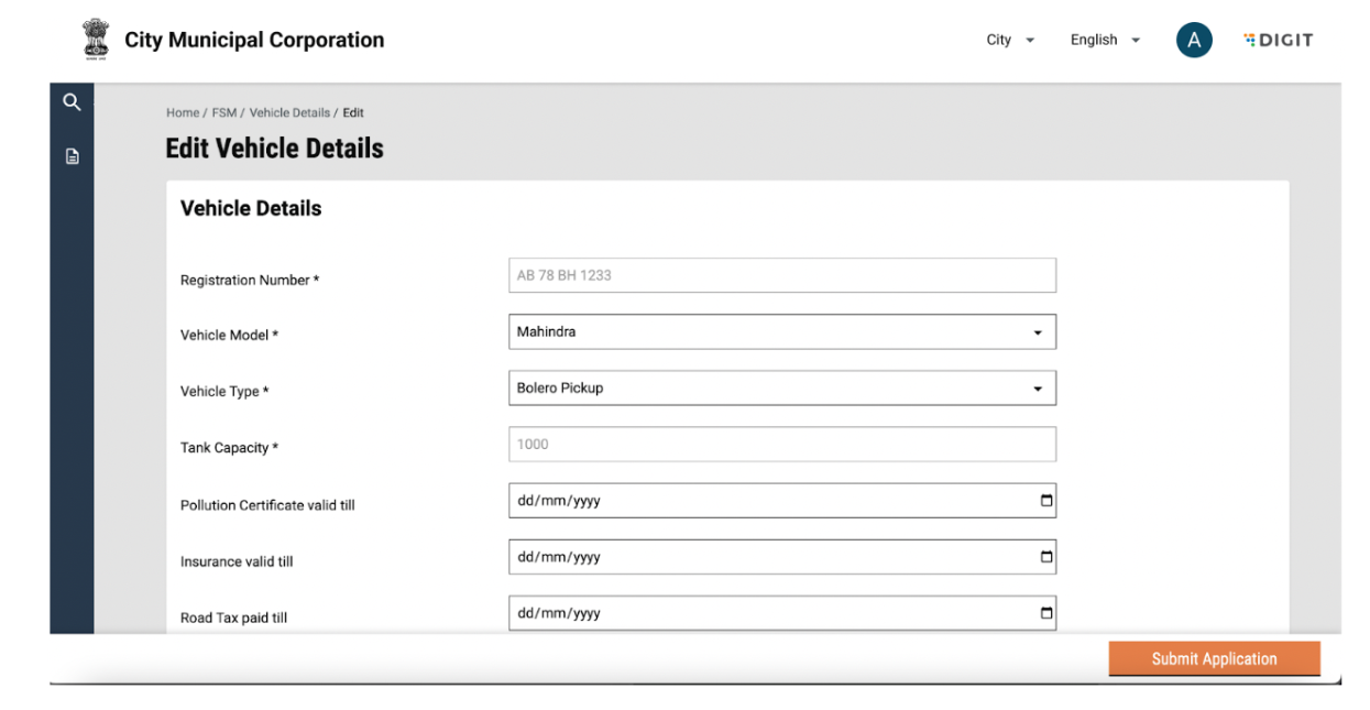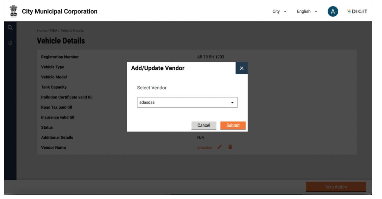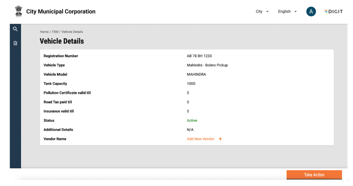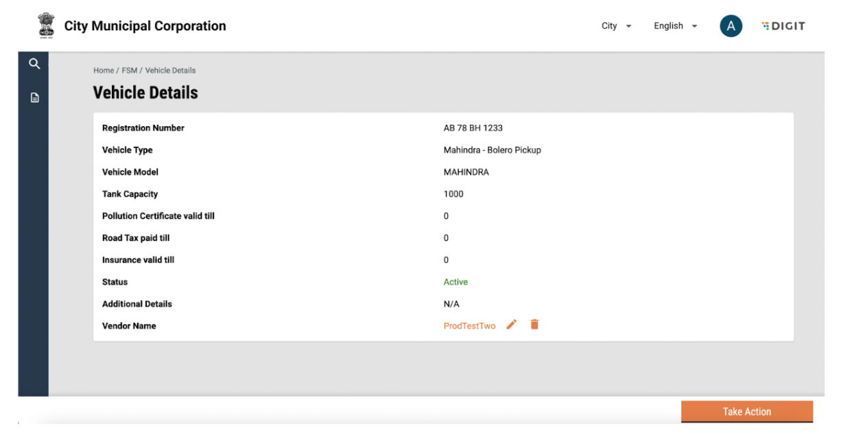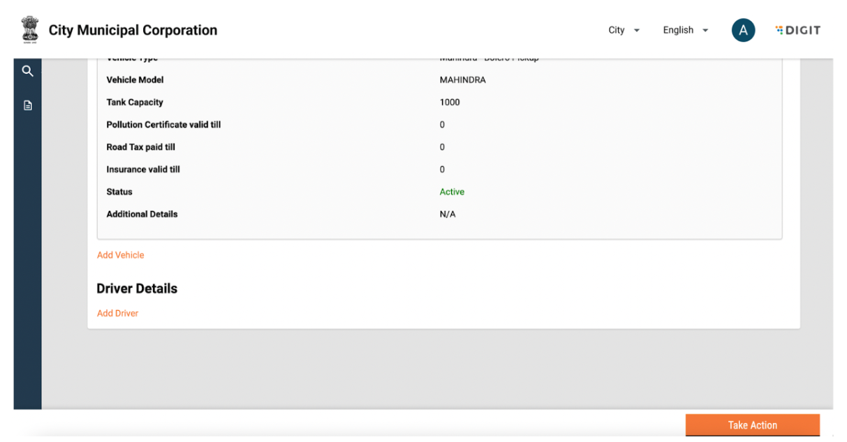 Vehicle details can be edited by clicking on the “Take Action” button and selecting edit. Add or edit information and click on submit application. The changes will reflect in the vehicle details page.