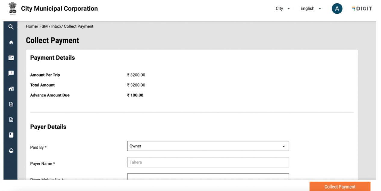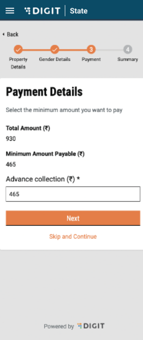 The user is redirected to the “Payment Details” page. If an advance has been configured in the backend by the ULB, the advance amount is displayed on the screen. The user can enter the advance amount. If an amount below the advance amount is entered, then an error is displayed. To confirm, the user can click on ‘Next’. The user is then prompted to “Check the Answers”.&#x20;