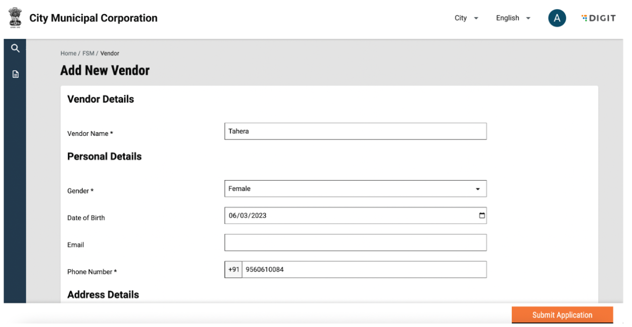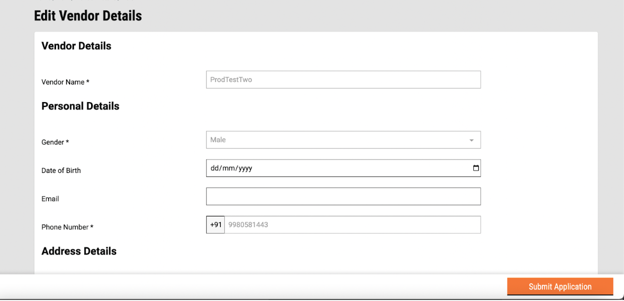 A new vendor can be added by entering details such as Vendor Name, personal details, including Gender, Date of Birth, Email and Phone number and Address details such as Door No, Pincode and landmark. Each vendor is created with a unique mobile number and hence, an error message will be displayed if the mobile number has been used to create other vendors. An error message will be displayed if all mandatory fields are not filled.&#x20;