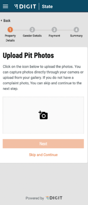 The user will be prompted to “Upload Pit Photos” by clicking on the camera icon. Once the button is clicked on, the user can choose the camera or select a photo from the gallery. If the user has the photo, he/she can upload the photo and click on ‘Next’. If not, the user also has the option to “Skip and Continue”.&#x20;