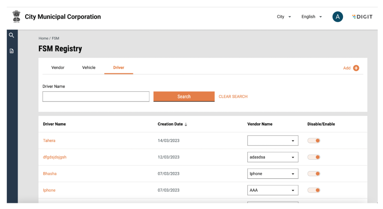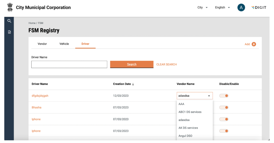 Drivers can be sorted by creation date, by clicking on the arrow beside the column heading. The user can enable/disable the vehicle using the toggle. The user can change the tagging of the Vendor by using the drop down in the “Vendor Name” column.