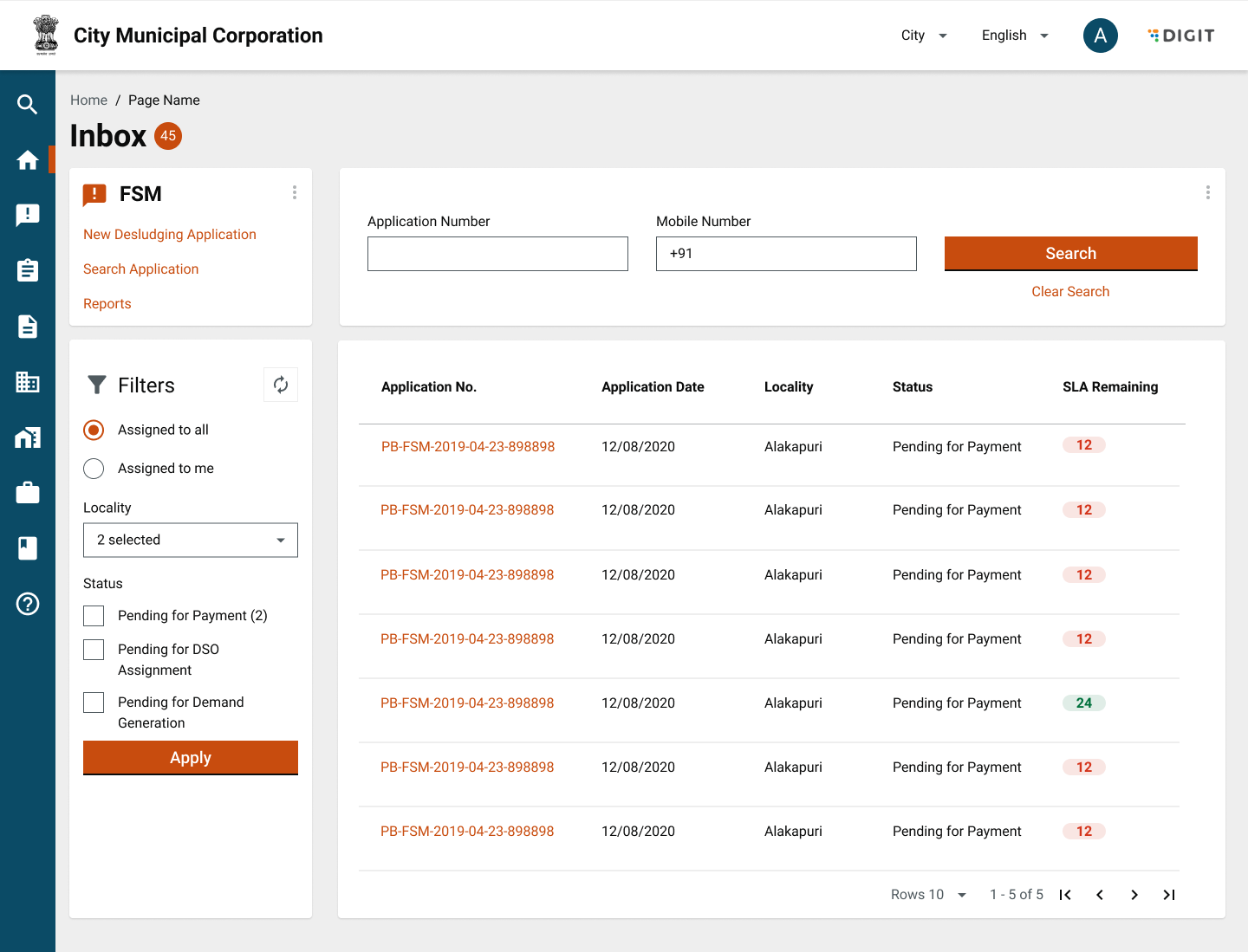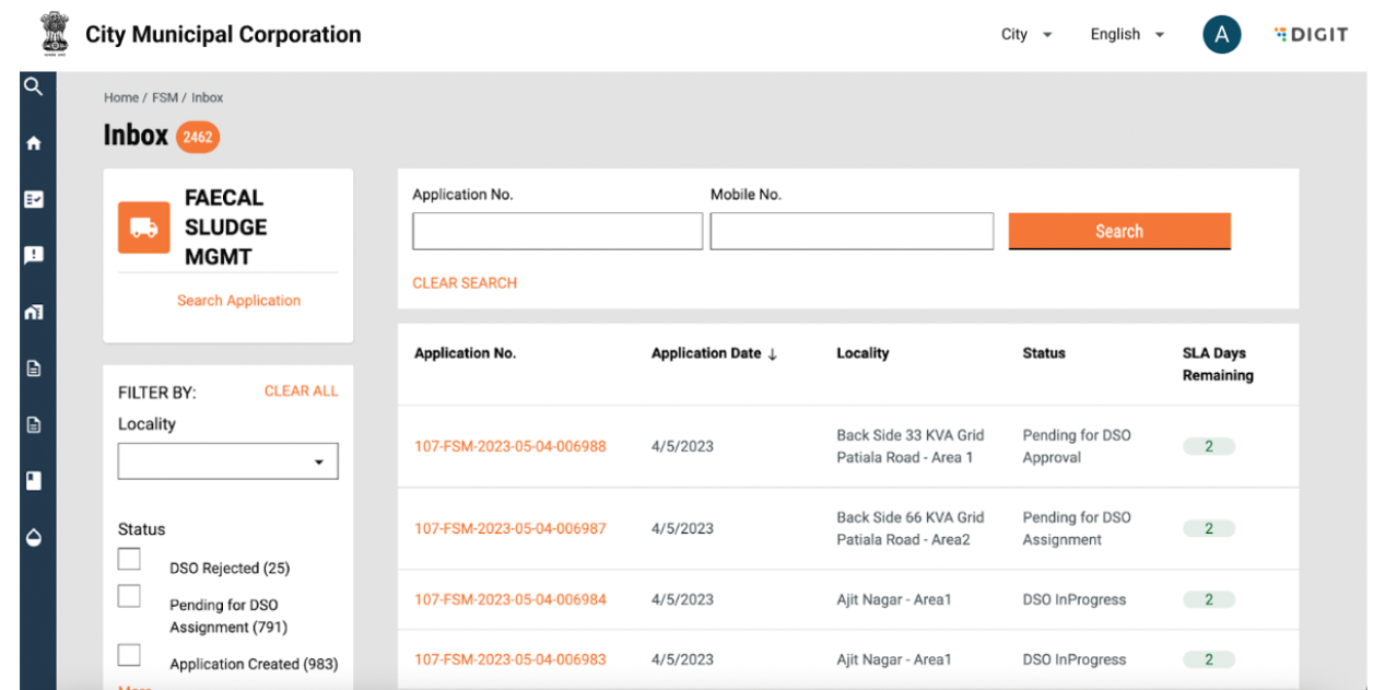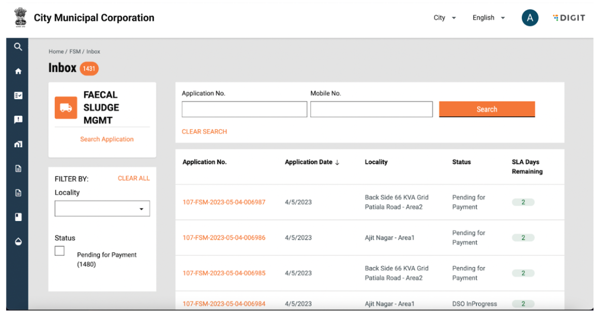 The user can search for an active application using “Application No.” and “Mobile No.” and click on search. This will return the application with the corresponding “Application Number” or the list of applications with the corresponding mobile number. The user can further filter applications based on the criteria on the left hand side, that is, Locality or Status.