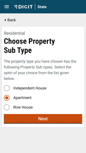 The radio button for the selected property type will be highlighted in orange.  The next button will only be deactivated and will be highlighted once the user has selected a property type.