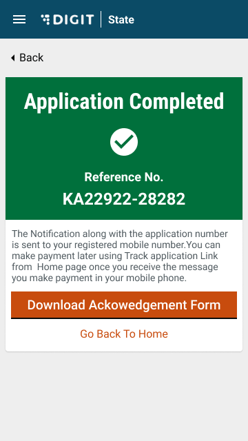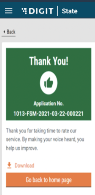 The user is displayed a confirmation message for application submission along with an application number. A download button can be used to download the application receipt as displayed below. The user can also go back home by clicking on the “Go back to home page” button.