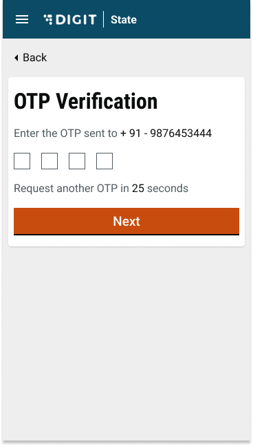 On clicking ‘Next’, an OTP will be sent to the user, and the user will be redirected to the following screen: