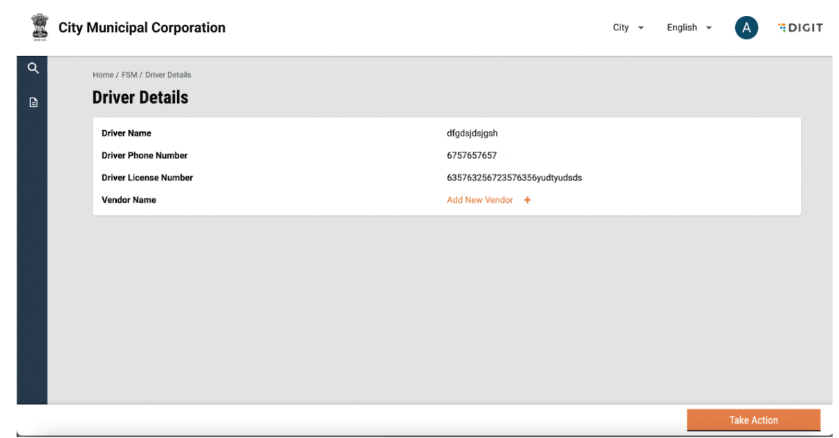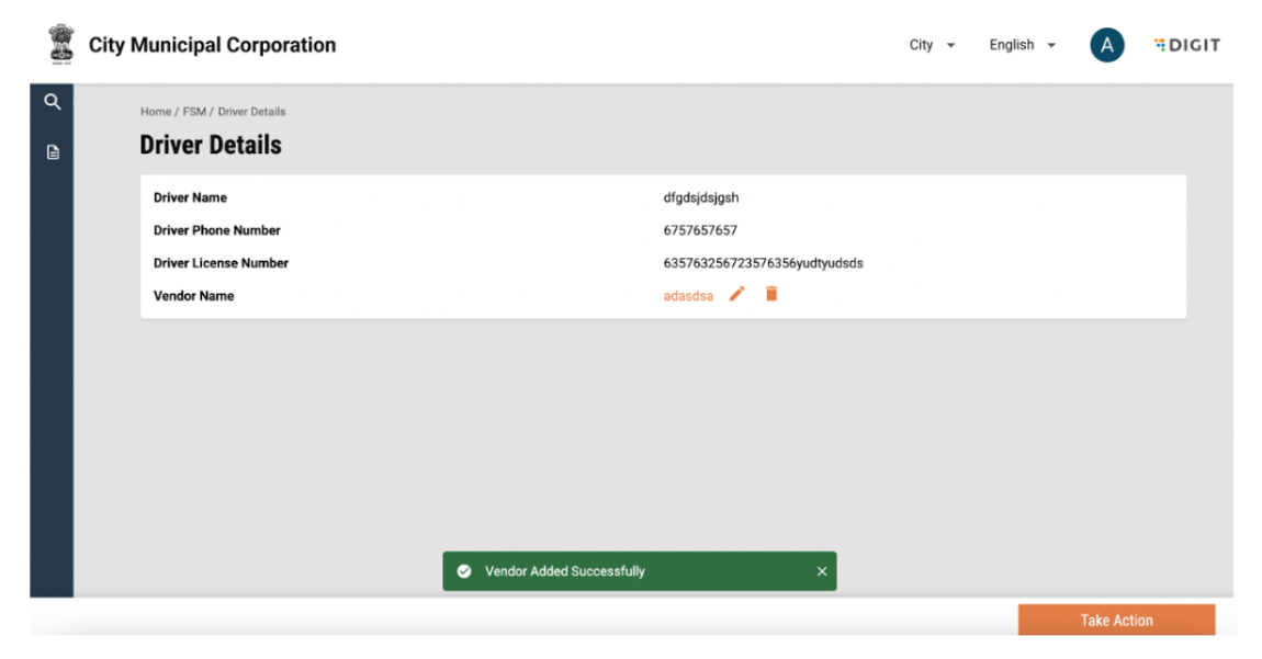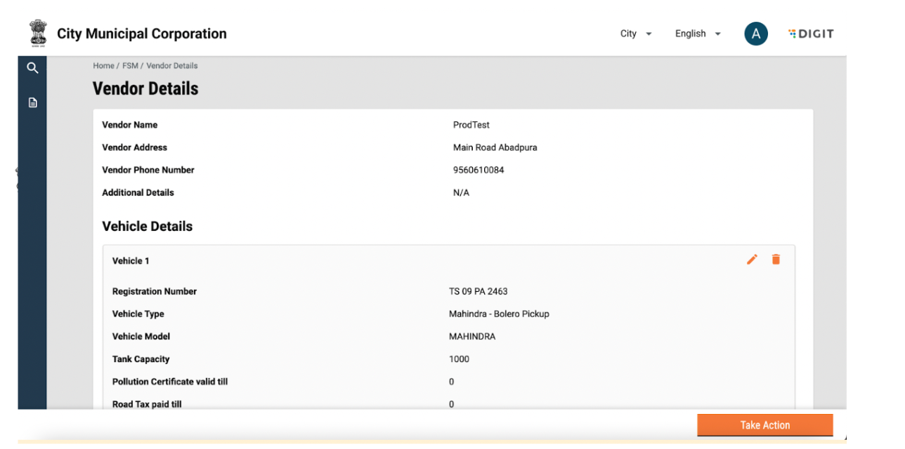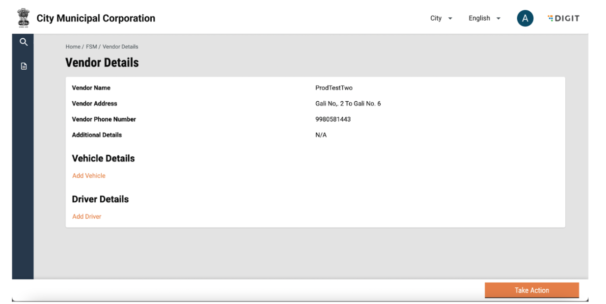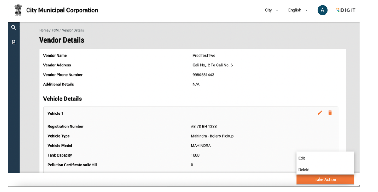 Vendor details can be viewed by clicking on the vendor name. This will display details such as name, number and address. Details of vehicles and drivers tagged to the vendor will be visible on the screen. The user can go back to the FSM Registry landing page by using the breadcrumbs.