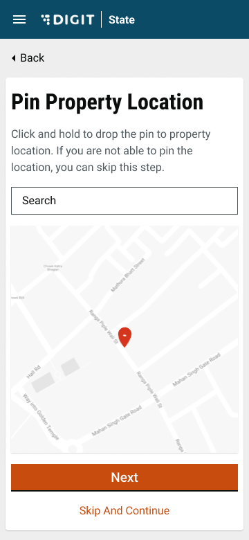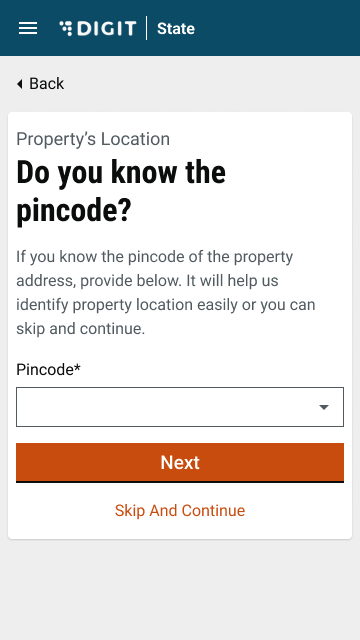 The user is prompted to select the pincode for the property location using the map or search a location using the search bar. The user can also drag the point on the map to the selected location. If the user knows the pin location, he/she can enter the details and click on ‘Next’. If not, the user also has the option to “Skip and Continue”. If the pin location is not selected, the user is redirected to enter the pincode.