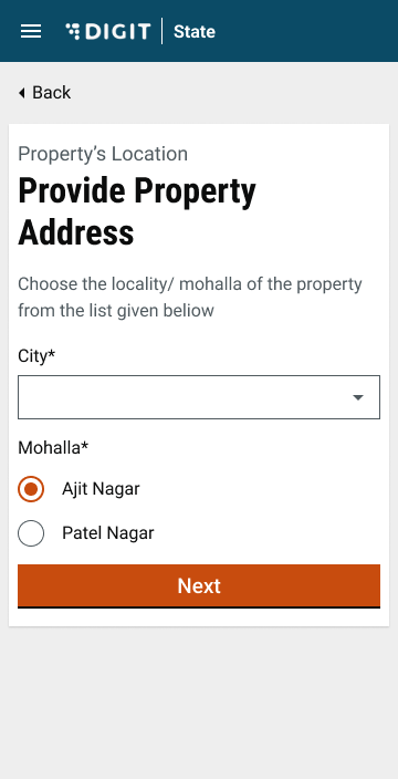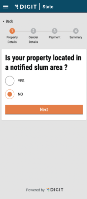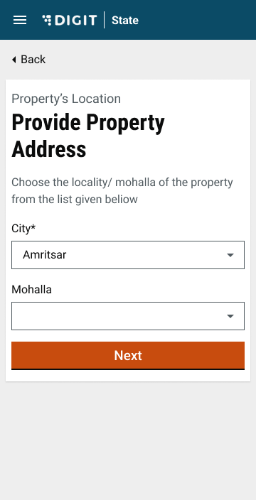 After this, the user will be redirected to the property address page and he/she will have to select a city and a mohalla. Both of these are dropdowns. The city dropdown is populated based on the tenants created in the system. The list of localities/mohallas will be from the MDMS. The next button will be deactivated and will be highlighted once the user has filled in the details. Once a property address is provided, the user is asked to select whether the property is a slum.