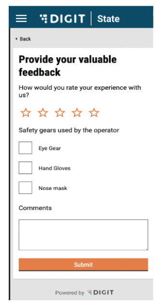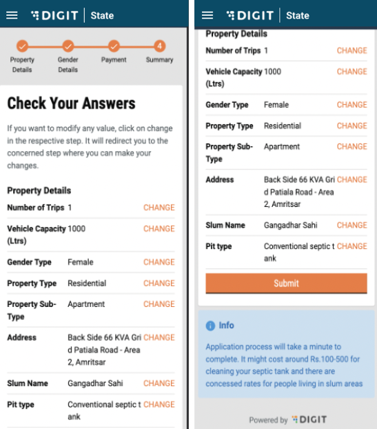 A change option is displayed beside each answer. In case the user wants to edit any details, the user can click on the change button and the user will be redirected to that part of the workflow. If not, the user can click on ‘Submit’.